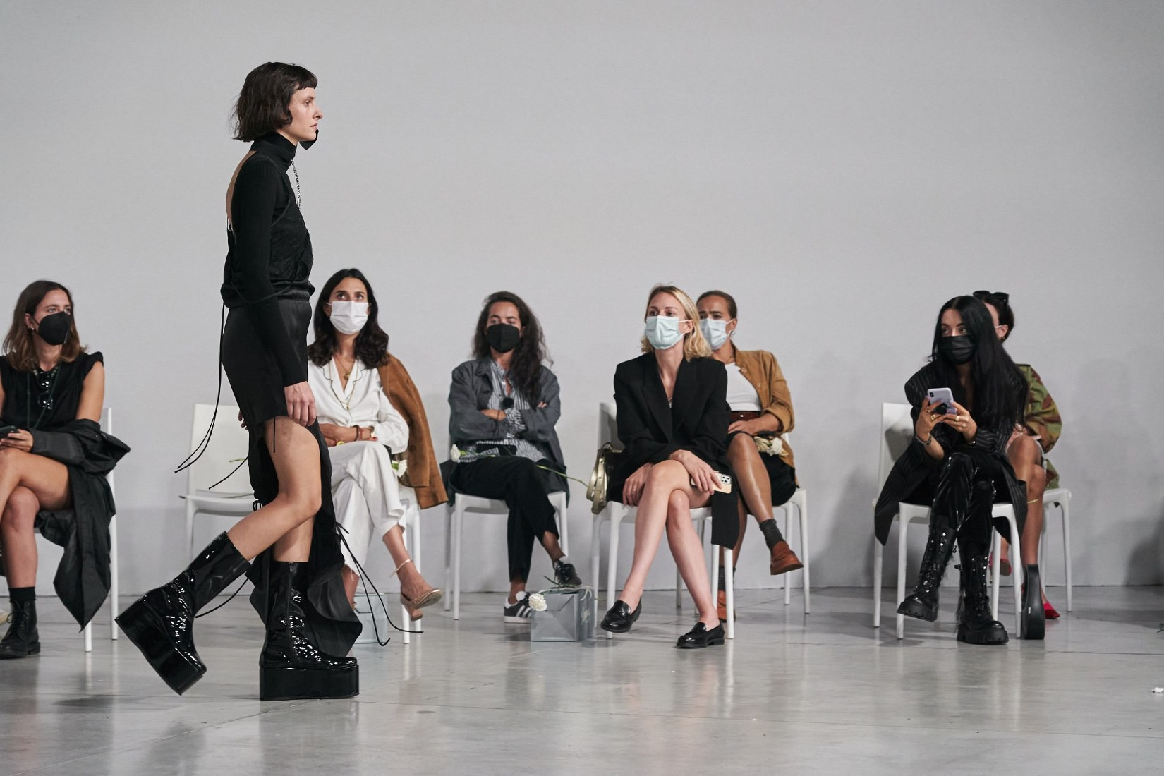 To round out the looks, Baseball hats with punk-soul feathered mohawks are proposed by A.C.9 SS22, in stark contrast to the tenderness of the earrings, which are decorated with crystal pendants and a maxi bow. Ox eye sandals and wedges, leather or eco-fur slippers, and boots with an exaggerated and subterranean platform are among the footwear options.