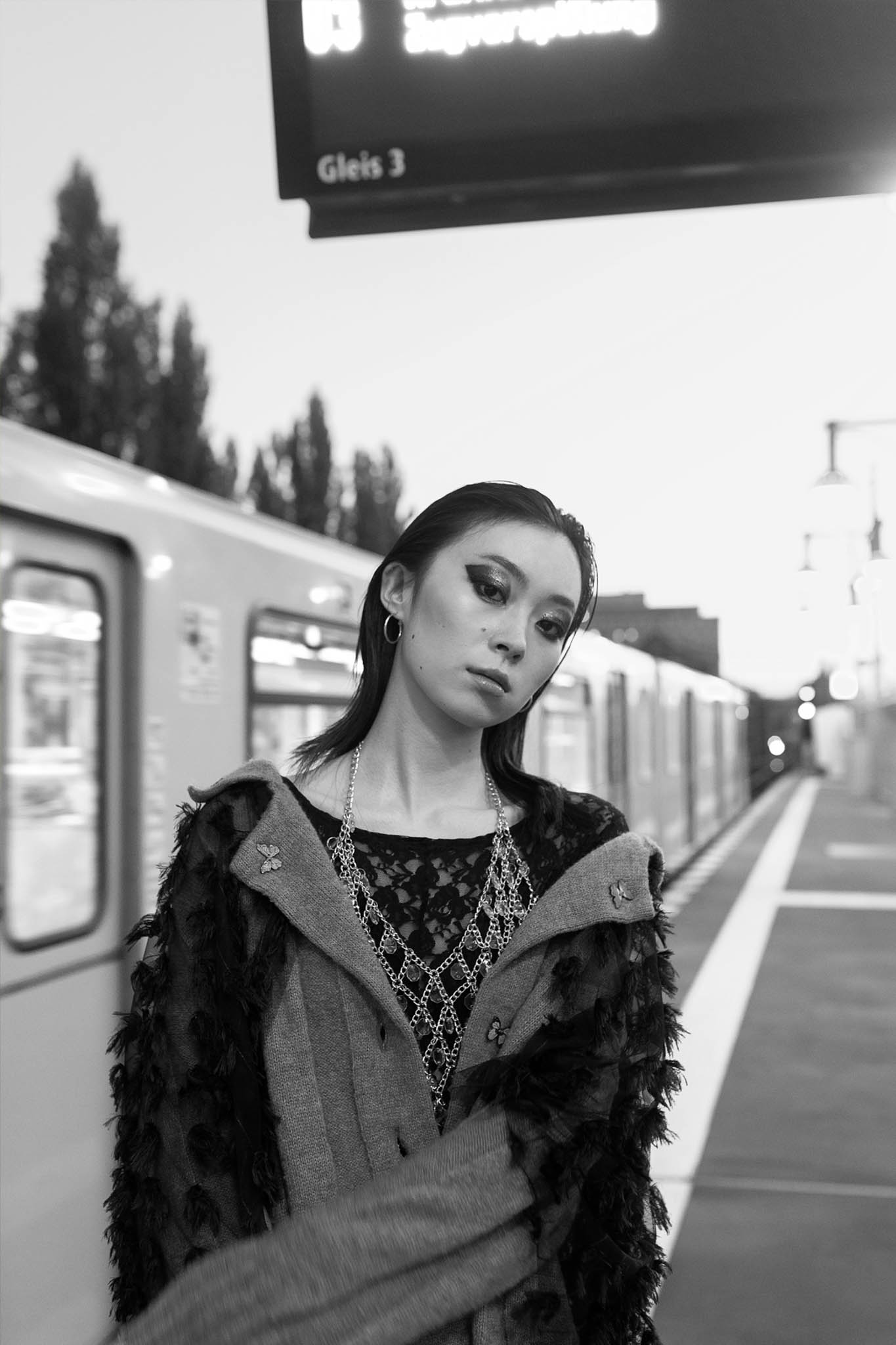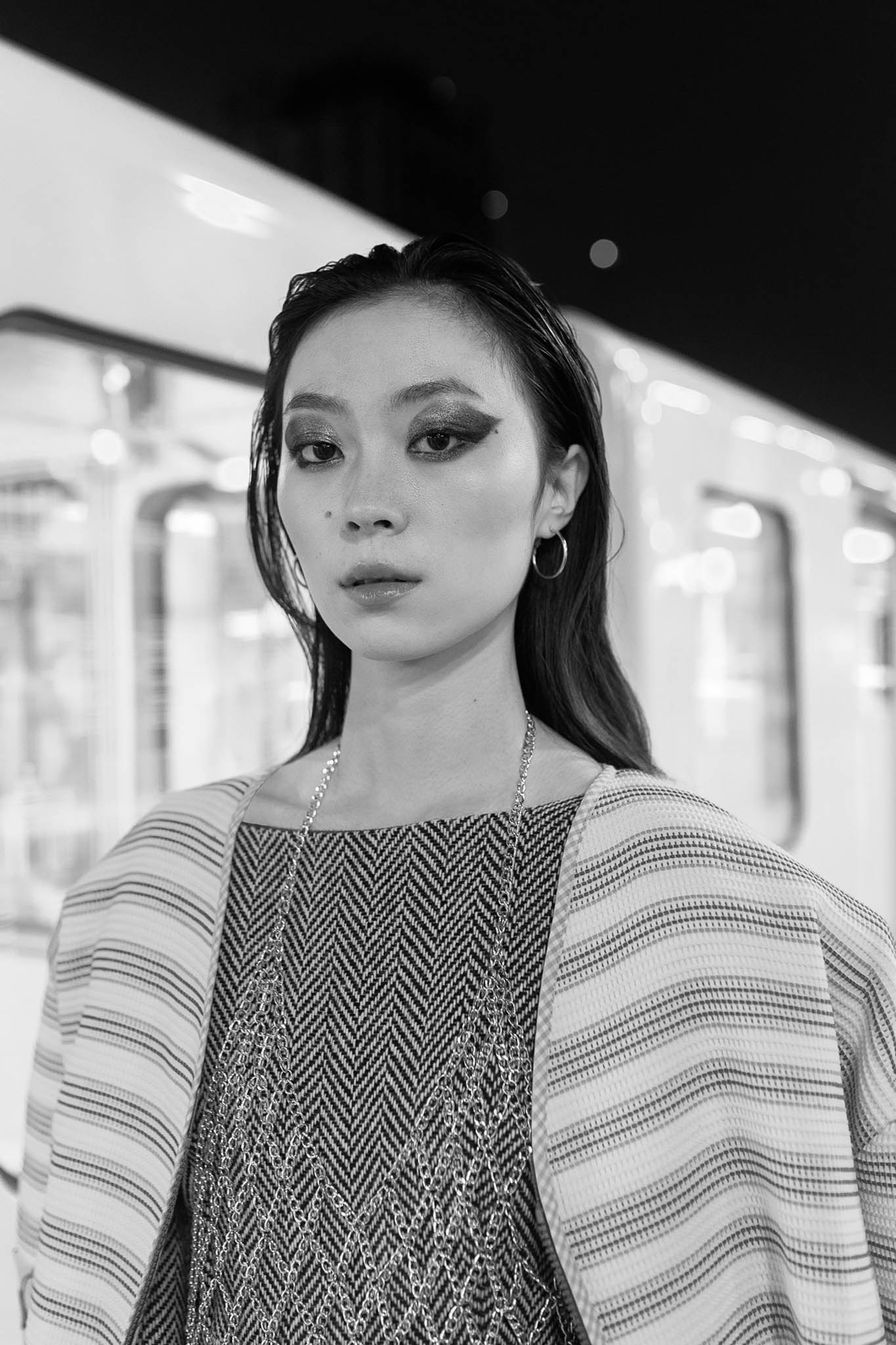 Mysterious woman in gothic attire with chain headdress and dramatic lighting.
