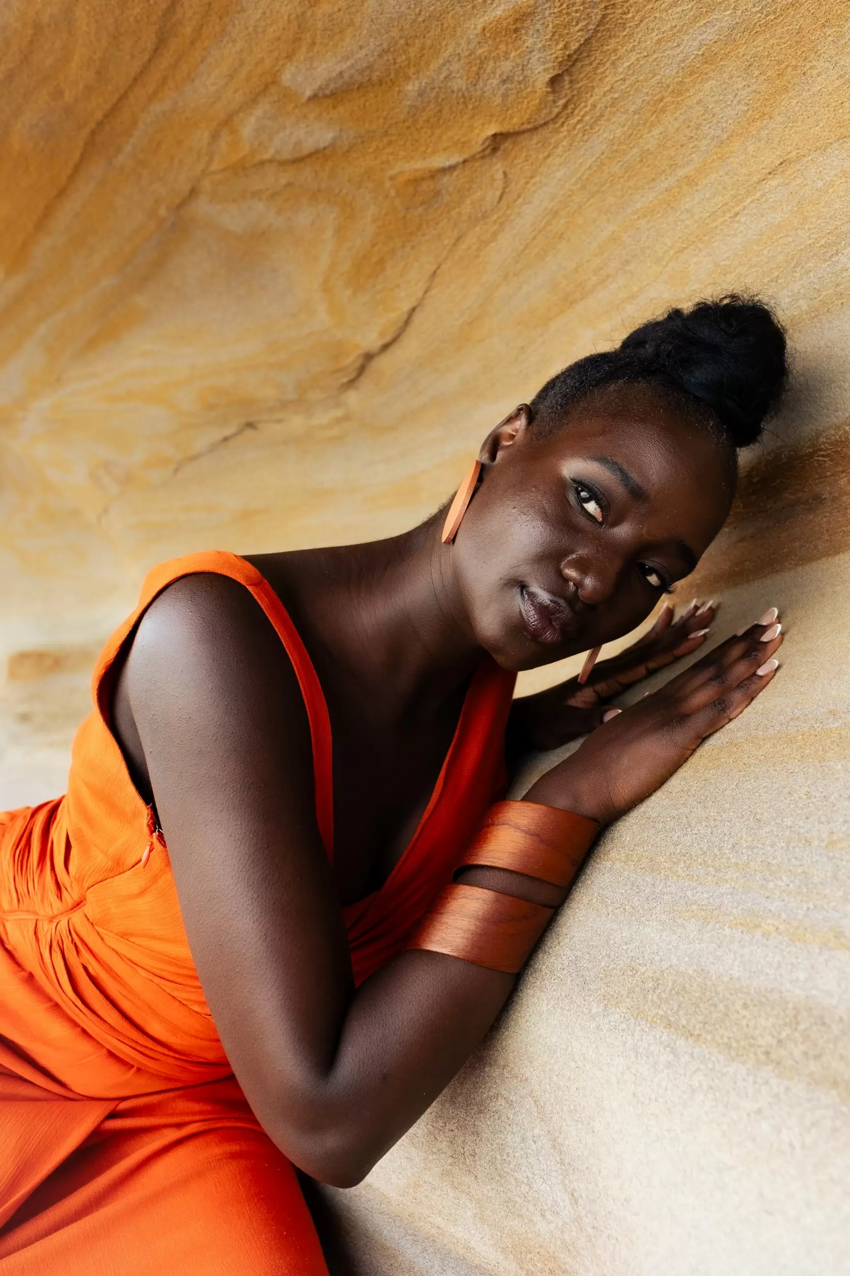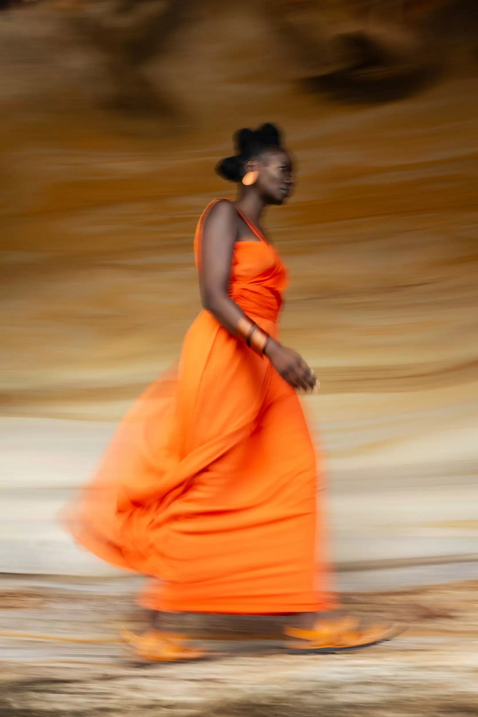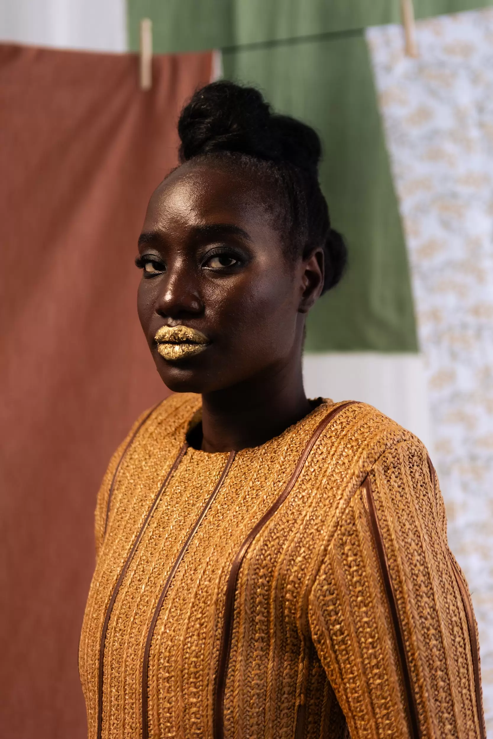 The Aya Maxi Dress, the first finished piece from the Arcadian Collection, truly captures the essence of the collection—drawing inspiration from the landscapes of Nigeria, its riverine areas, and the intricate artistry of Igbo Ukwu artifacts, which have been transformed into textile patterns. These patterns, especially visible in the scarves featured in the campaign, create a genuine visual language that ties the collection to its cultural origins.