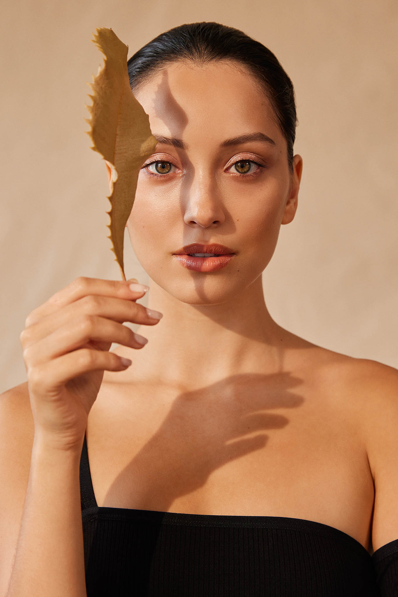 Elegant woman with artistic hairstyle and soft makeup, gazing downwards.