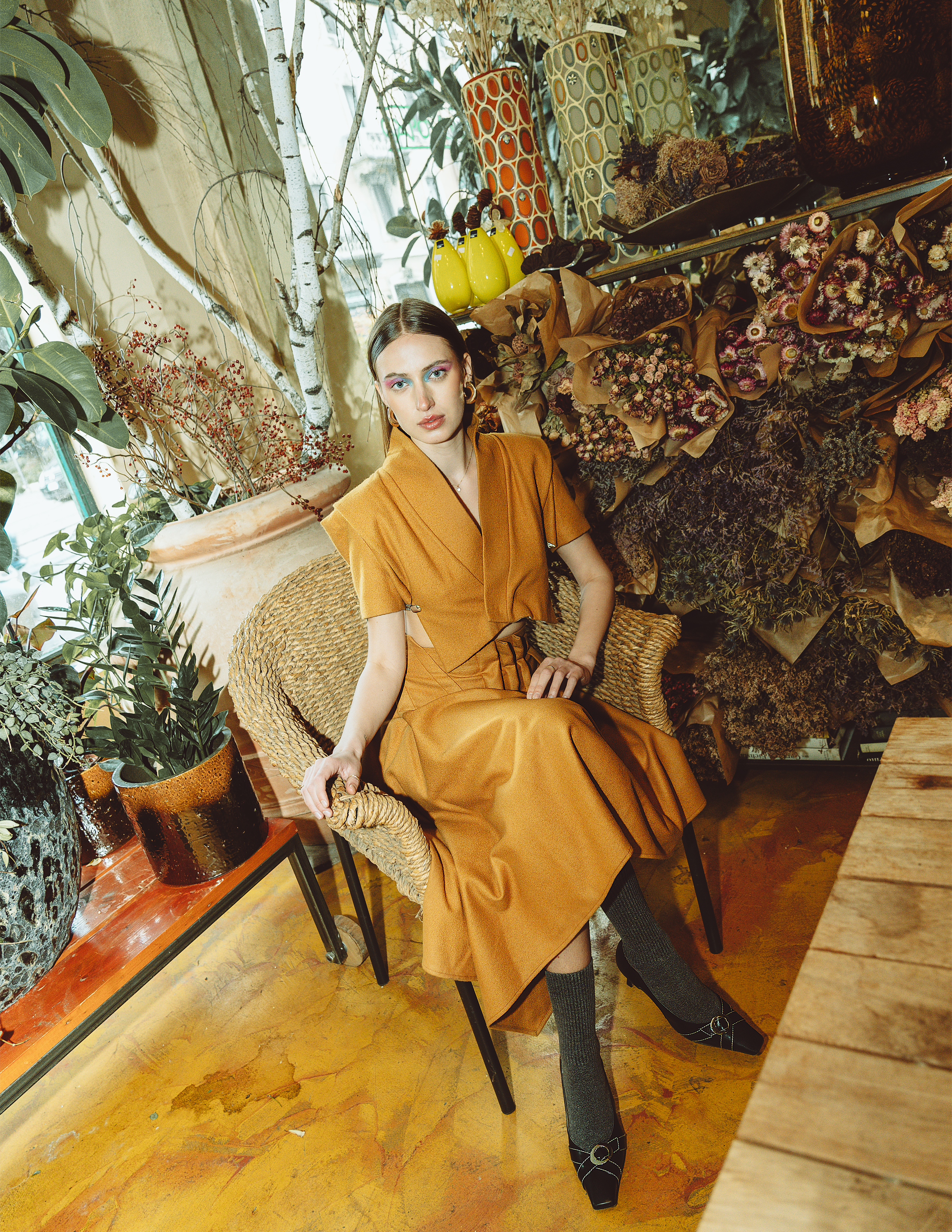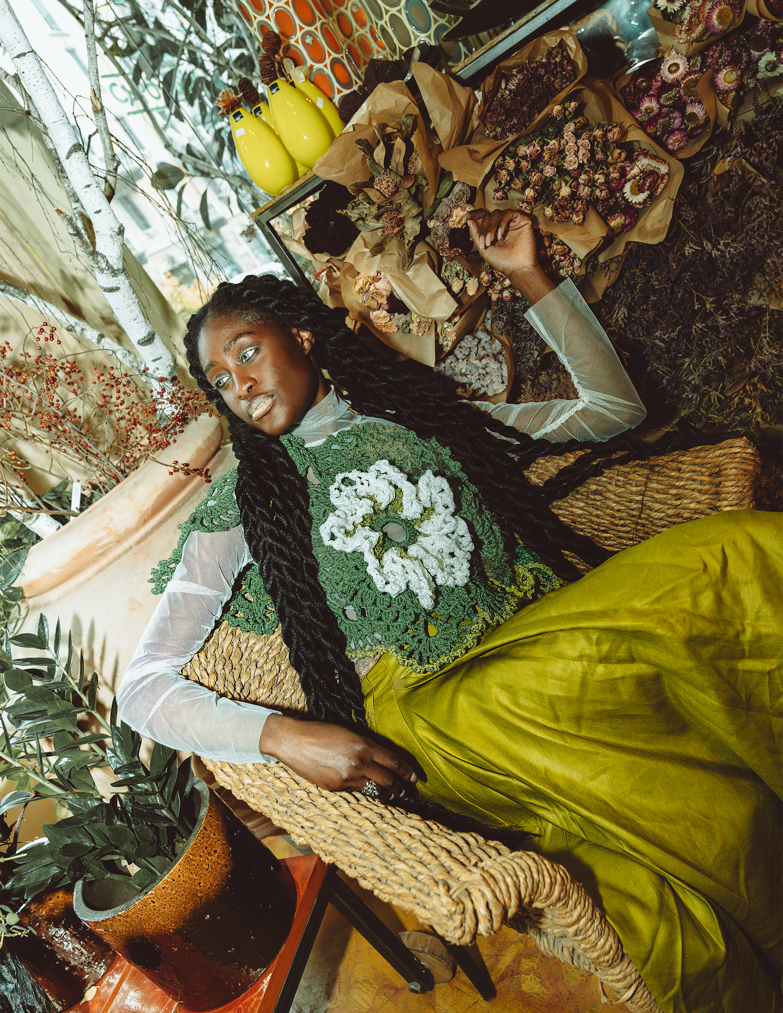 ChiaLi Hung / on the right recycled poncho, recyled silk sleeves, long printed net skirt by ChianLi Hung // Looks 2: White recycled poncho, recyled silk sleeves, long printed net skirt by ChianLi Hung // Look 3: Semi-transaprent shirt, knitted floral top, skirt MODEMENT OFFICIAL FW 24 via MEI COMMUNICATION // Look 4: Top and skirt set MODEMENT FW 24 via MEI COMMUNICATION; jewels, socks and shoes stylist’s own // Look 5: Red vintage cardigan, strawberry print, t-shirt and necklaces stylist’own, burned nylon baggy pants by Gianfranco Tittarelli, shoes BALENCIAGA // Look 6: Shirt and rings stylist’own, coat MODEMENT FW 24, bag Sveva, shoes BALENCIAGA // Look 7: Waterproof quilted shirt jacket, formal baggy pants by Gianfranco Tirrarelli, Shoes and glasses stylist’own // Look 8: T-shirt, tie and vintage cardigan styilist’own, formal baggy pants by Gianfranco Tittarelli