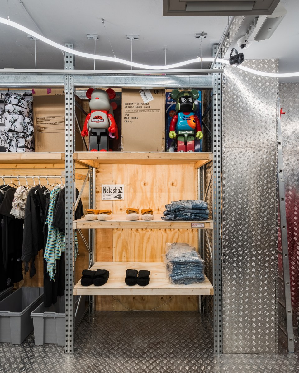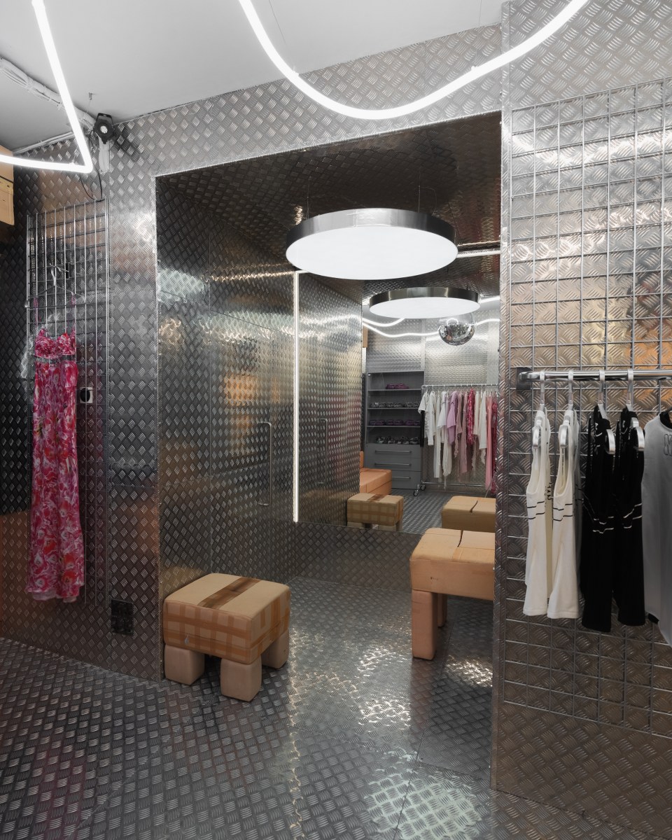 WRHS13 is not just a shop; it’s a multi-faceted space that serves as a store, warehouse, and backdrop to emerging voices across industries and a platform to amplify their message and talent. Meanwhile, upcycled cardboard boxes continue to line the walls; space is well-spent as display rails are built into storage racks for online stock. Soft, furry seating tempers the industrial steel while the matcha machine bubbles in the background. Every little brown box is practical and metaphoric, a constant reminder of triumph over adversity through adaptability. Every matcha latte brewed denotes the designer’s environmental and considered intentions, while the clothes serve authenticity and fun. Having designed three consecutive collections as commentary on our life in boxes, the houses, shops, offices, and screens we inhabit, Natasha Zinko is the self-proclaimed ‘Queen-of-Boxes’. And just as her AW23 empowers individuals and celebrates their strengths in all its forms, so will WRHS13.