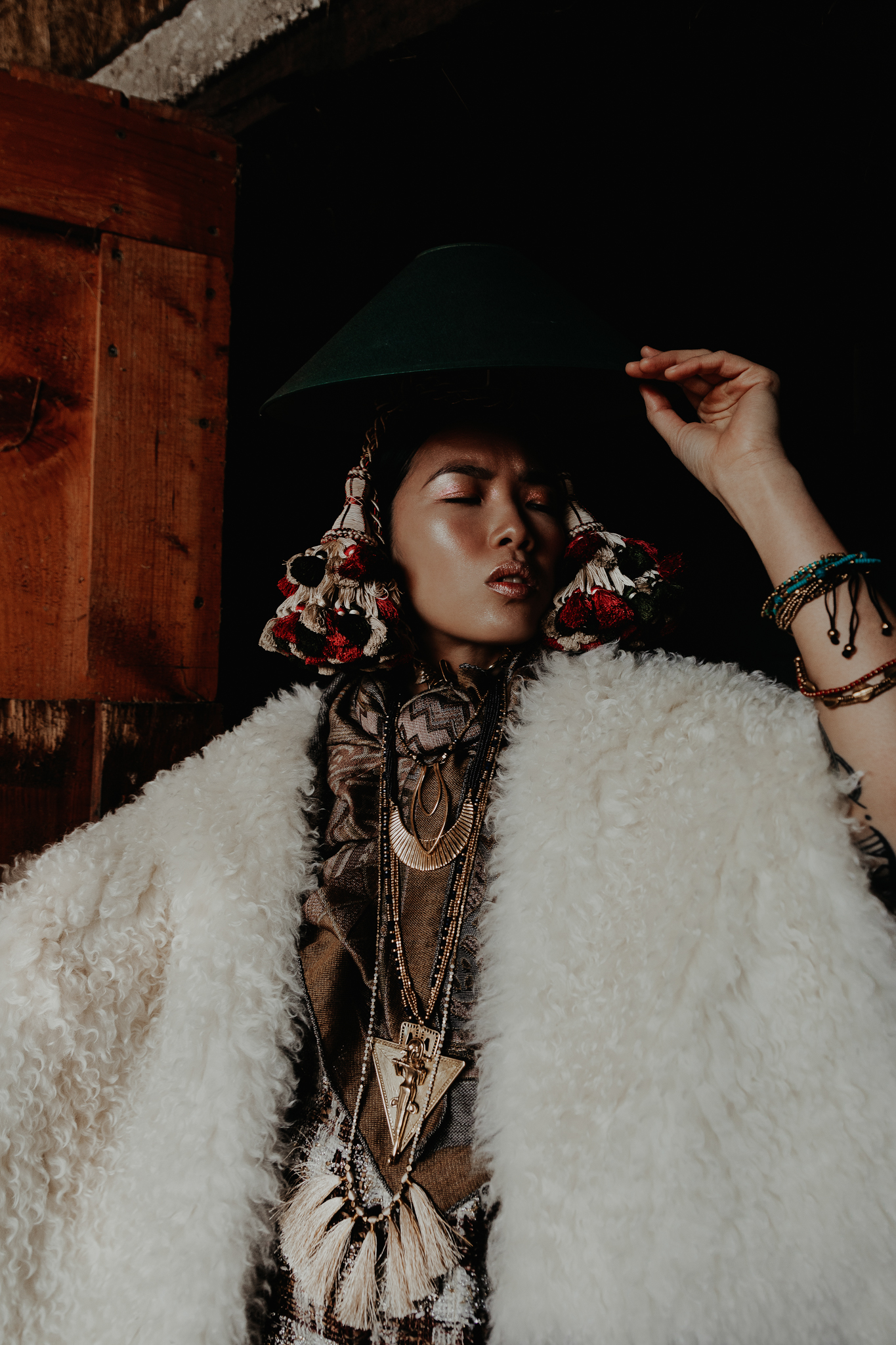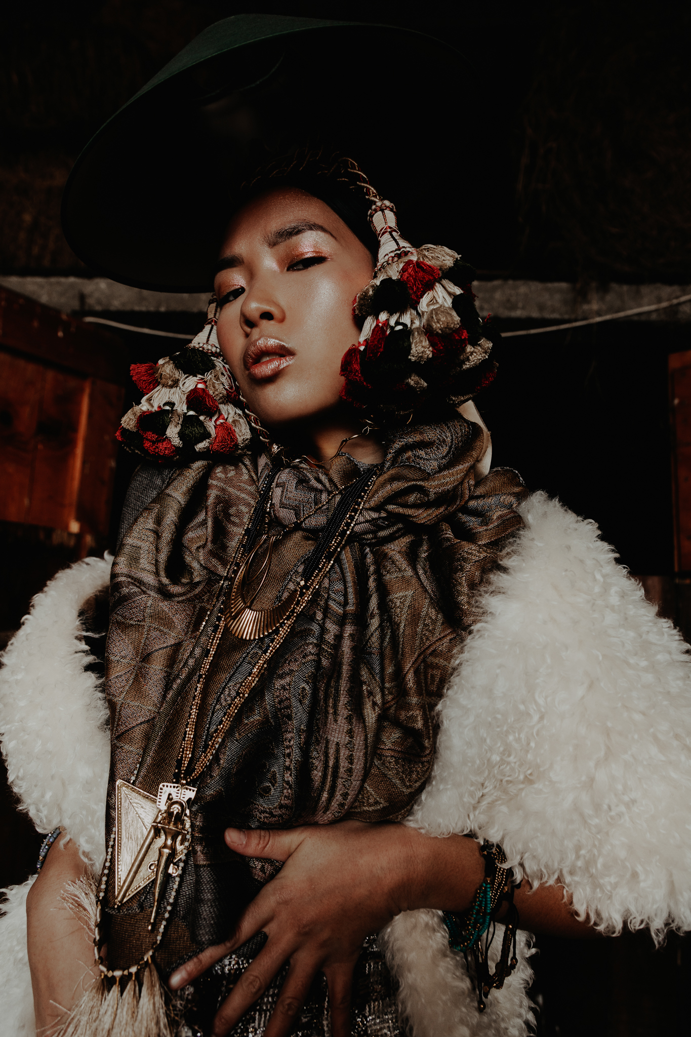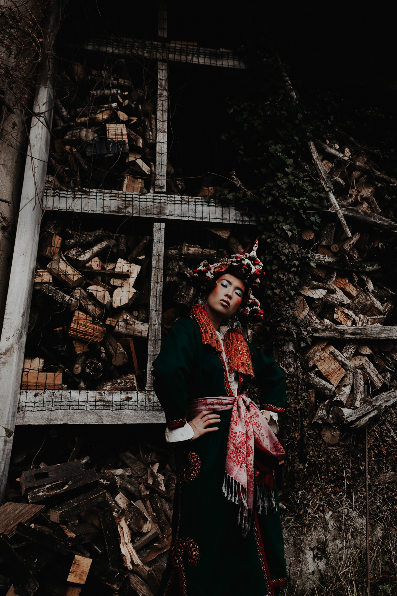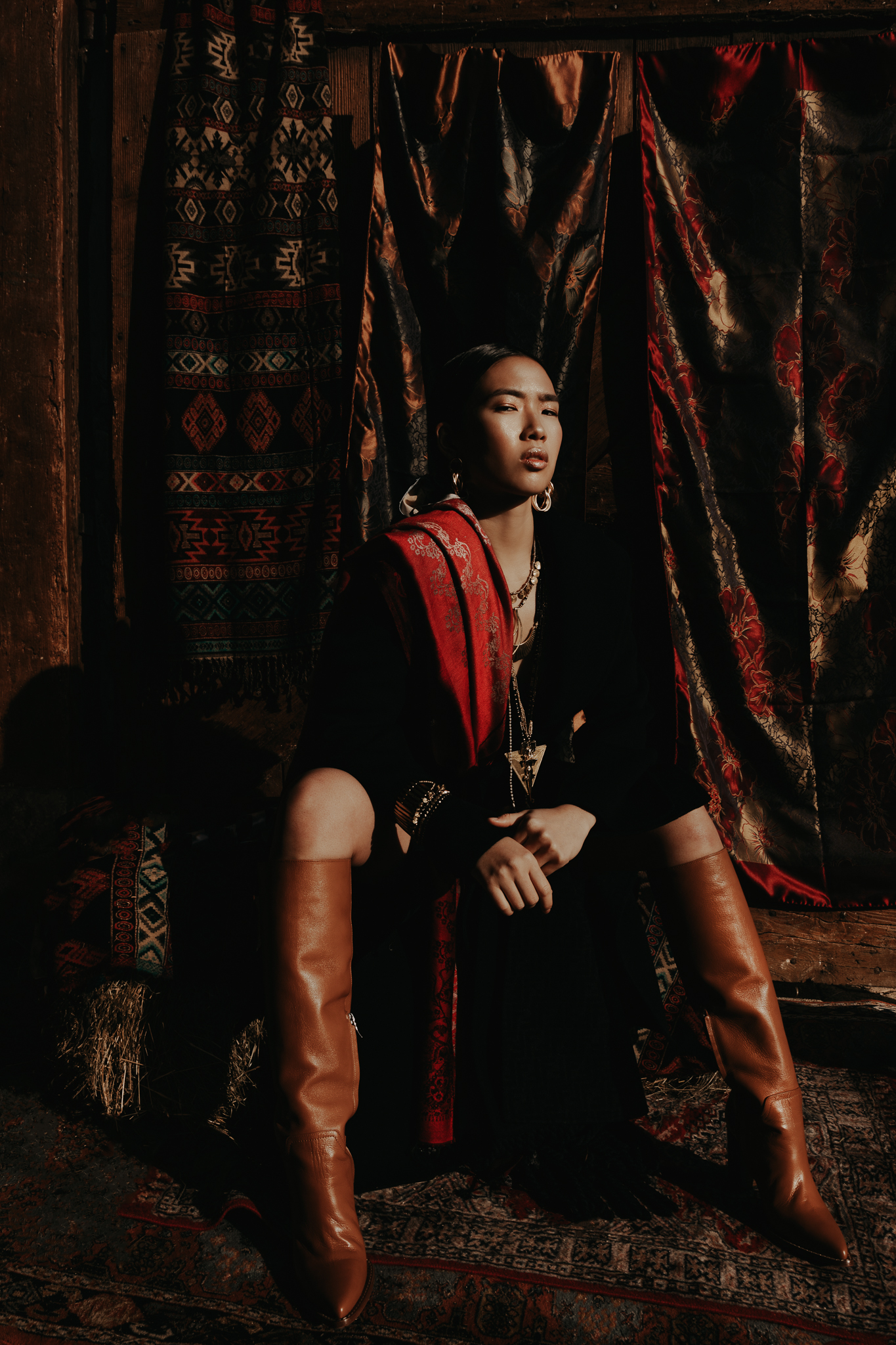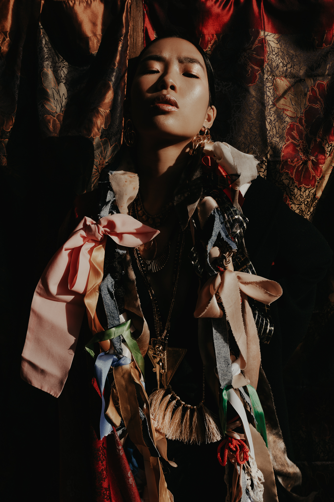 Mysterious woman in gothic attire with chain headdress and dramatic lighting.