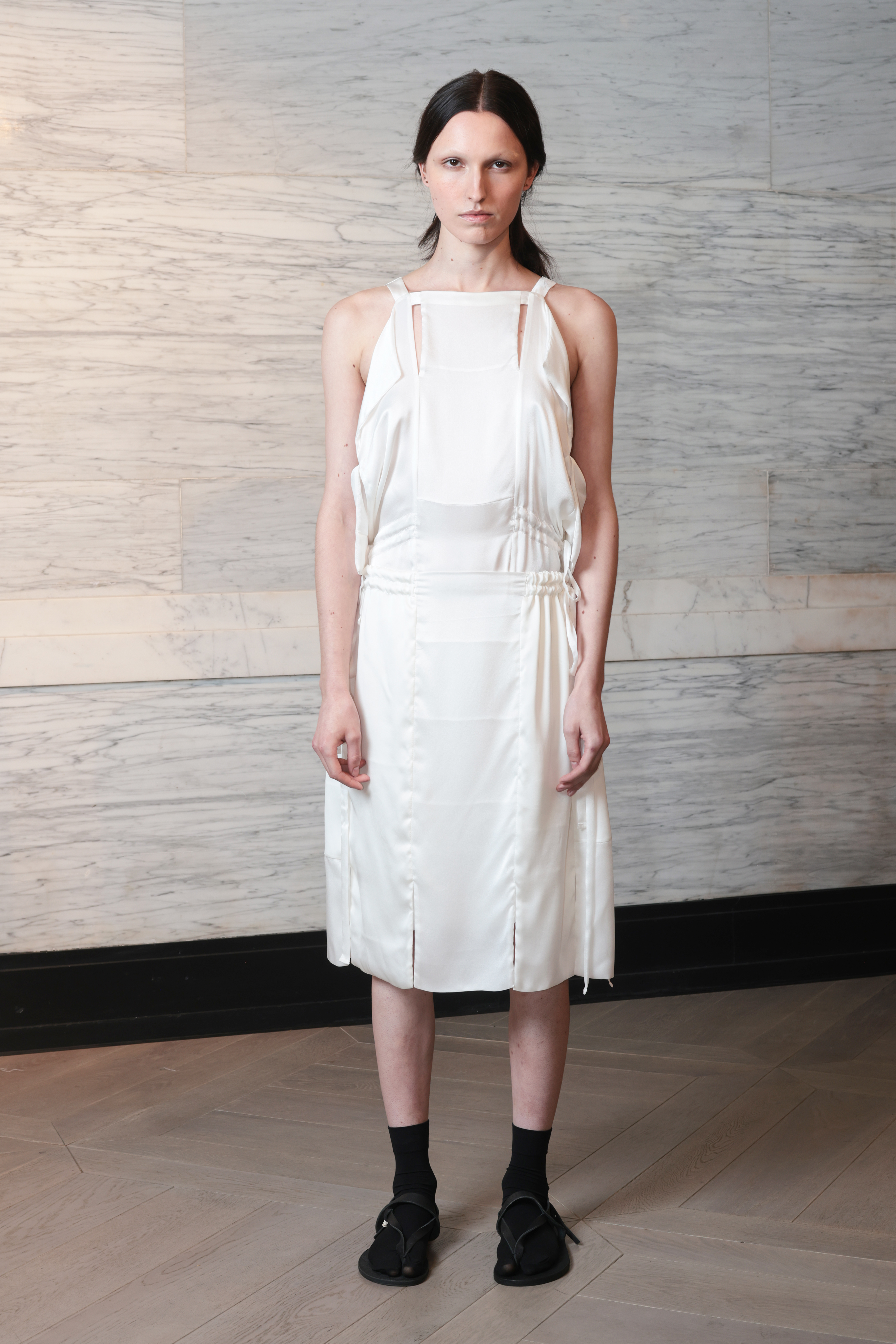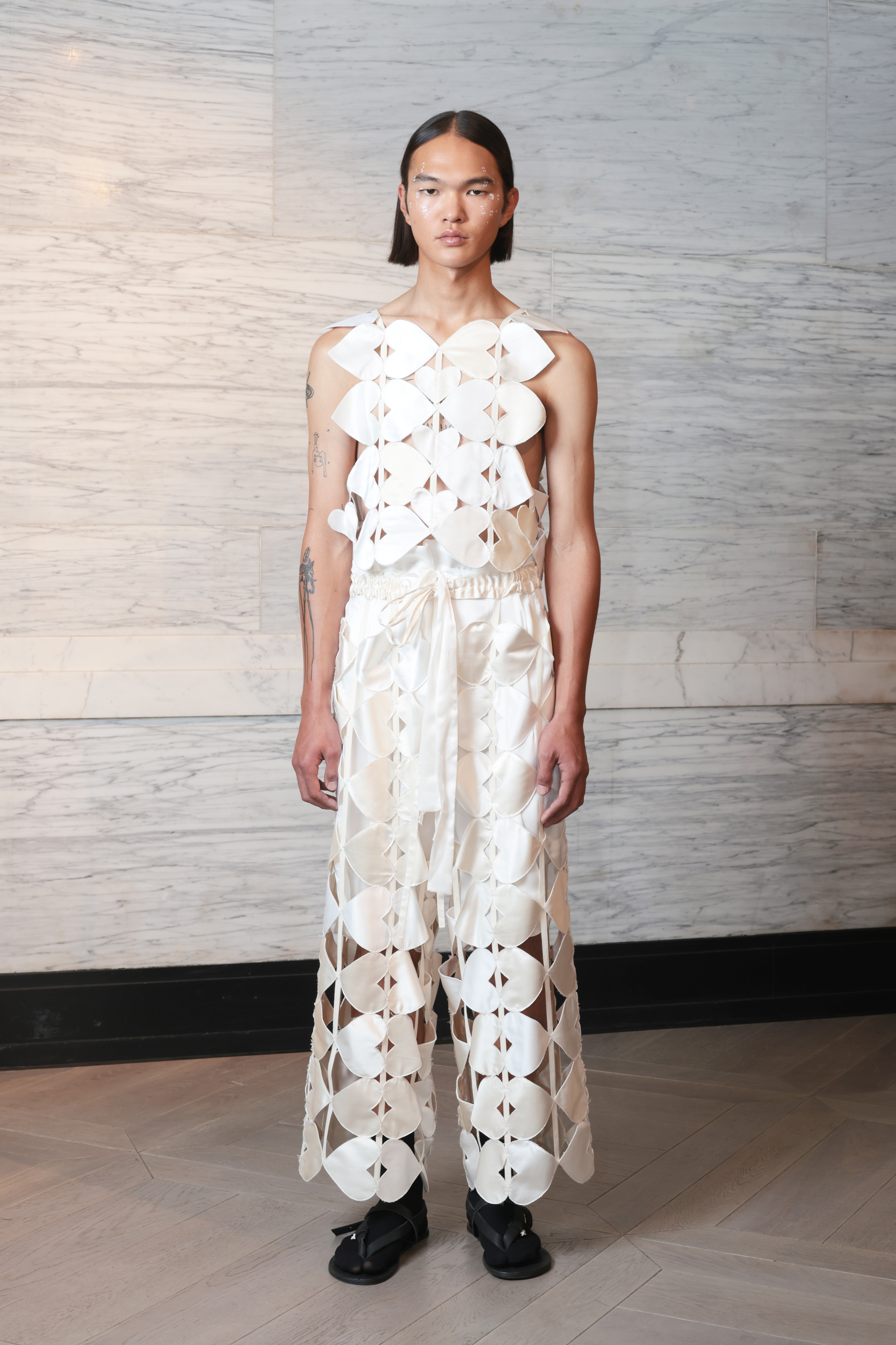 Conveyed in a predominately black and white palette the collection saw ethereal and elegant pieces featuring heart shaped cut outs, deliciously draped silk panels and double hems juxtaposed with more understated designs. All were beautifully crafted and imbued with the designer’s exquisite trademark tailoring. These cool, covetable creations were presented to us by an array of wonderfully diverse models who illustrated that the designer’s ethical ethos extends beyond the future of our planet to also embrace those humans currently inhabiting it.