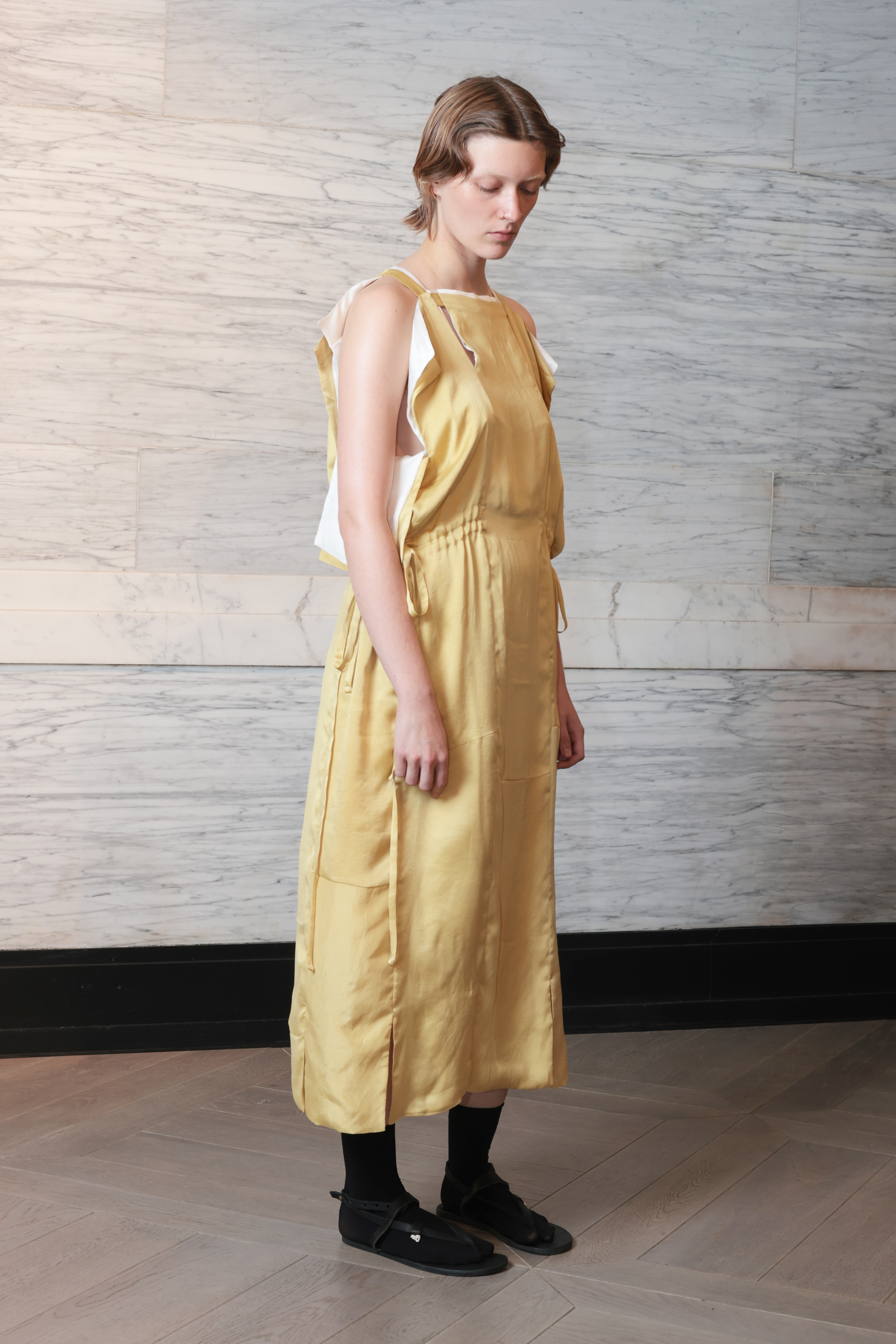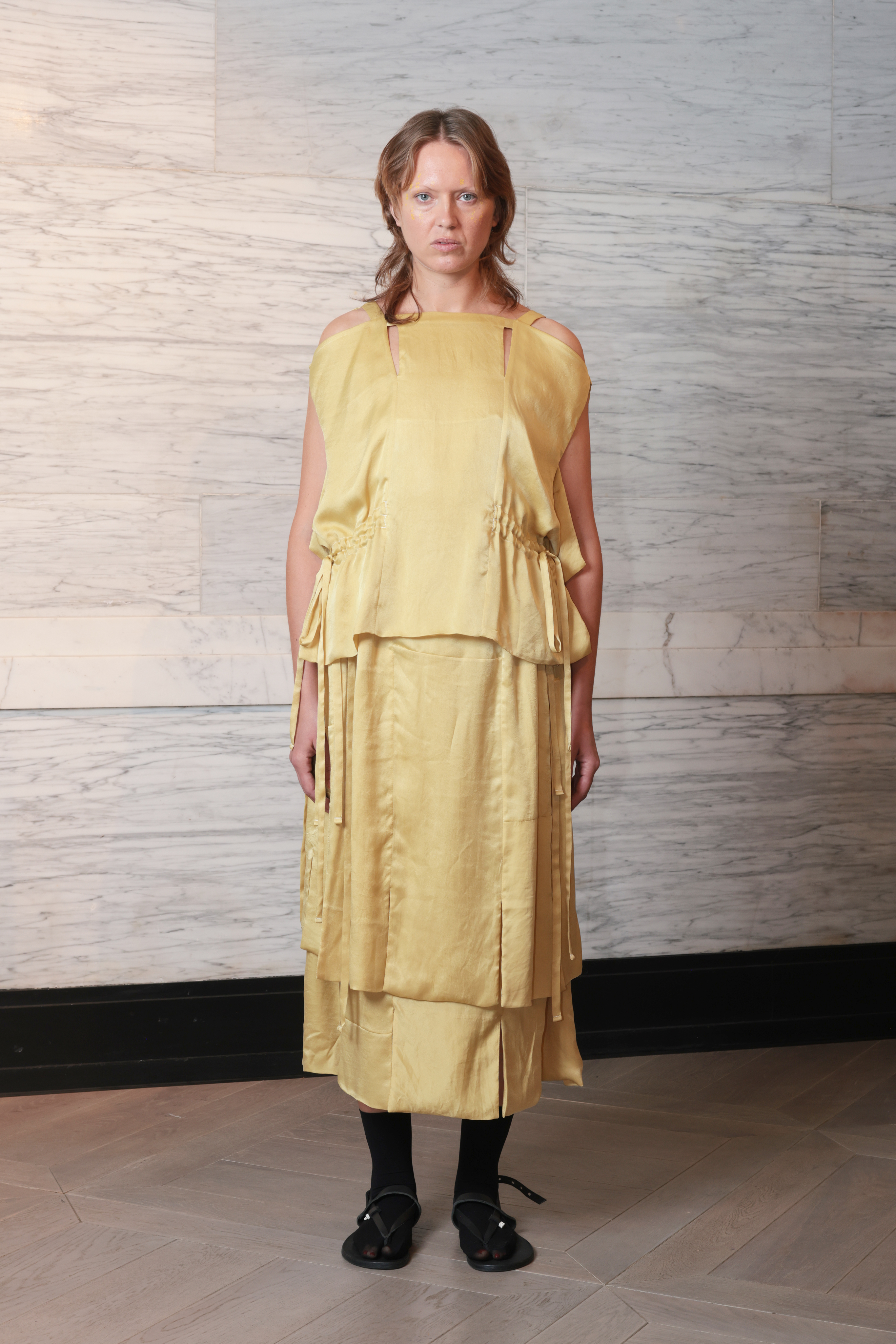 We are sourcing our waste materials from a variety of different companies who are also working towards less waste, for example we work with a network of bridal companies sourcing their off cuts and small bits of fabrics that they can’t use, we also work with digital print companies using their test lengths of fabric and then over dye them to obscure the print. We basically use the act of making the collection as a way to use up other people’s textile ‘waste,’ using our design as a way to imagine a new life for fabrics that would have otherwise gone into the bin or been left without use.