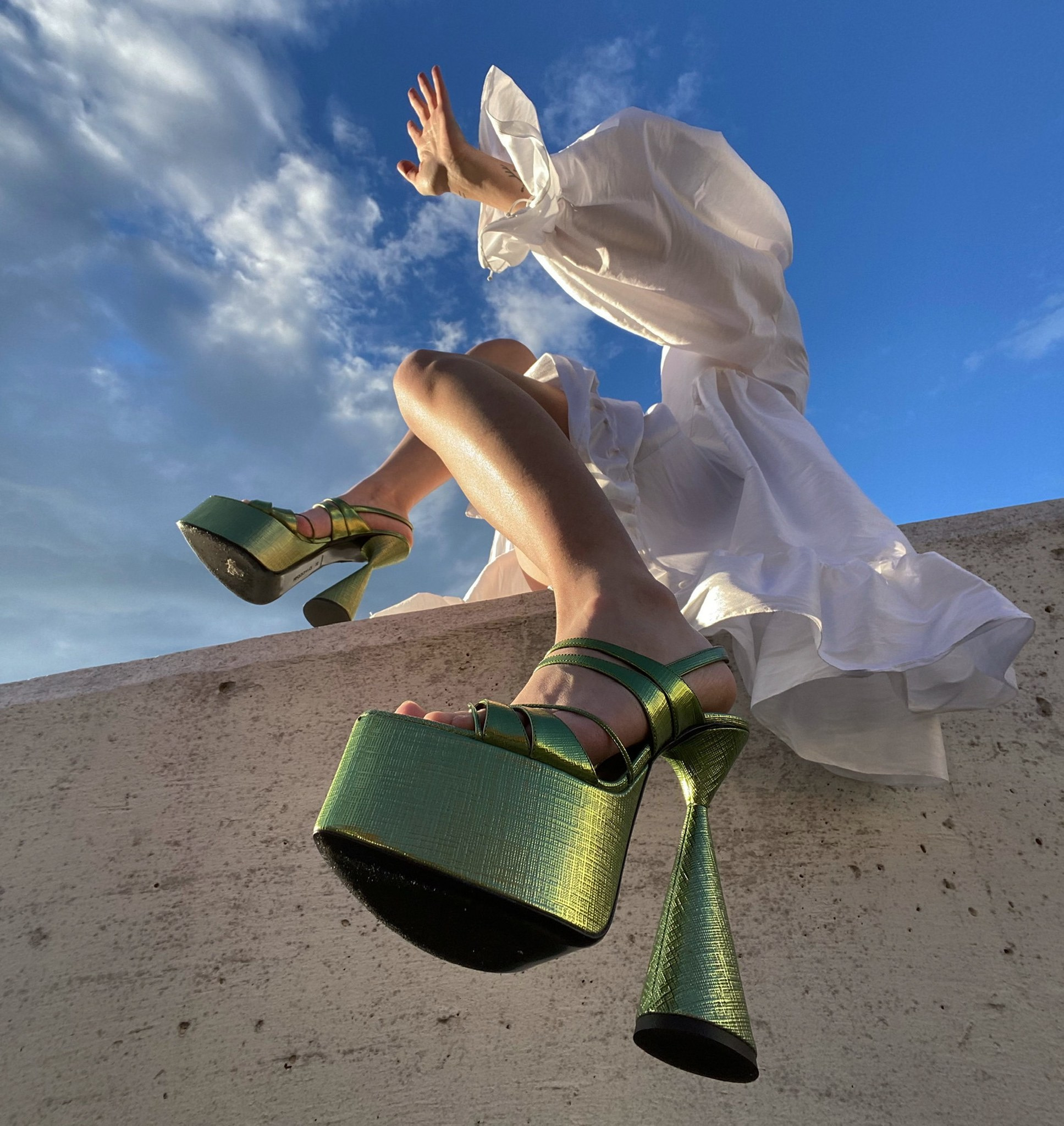 Magda has many incredible collaborations on her account but there’s one which is hard to beat. “I am still at the beginning of my art directing career, but my D’Accori campaign (which is the brand of those crazy green shoes I always wear), is still my favourite bit of work I’ve done. We came together with this idea of a girl getting dressed in the back of the seat with heels everywhere, having this nightlife, nighttime, sexy dark vision. I brought my photographer friend Daniel Tarcher (@danieltarcher) and we made the most magical photography, it’s so good. To this day, that is definitely my pride and joy. I am waiting for another campaign to top it but at the moment I think it’s too good,” she says.