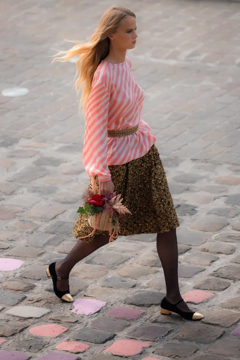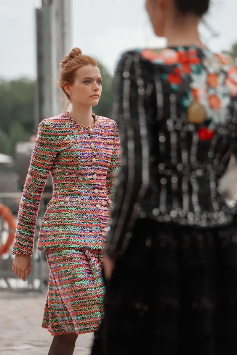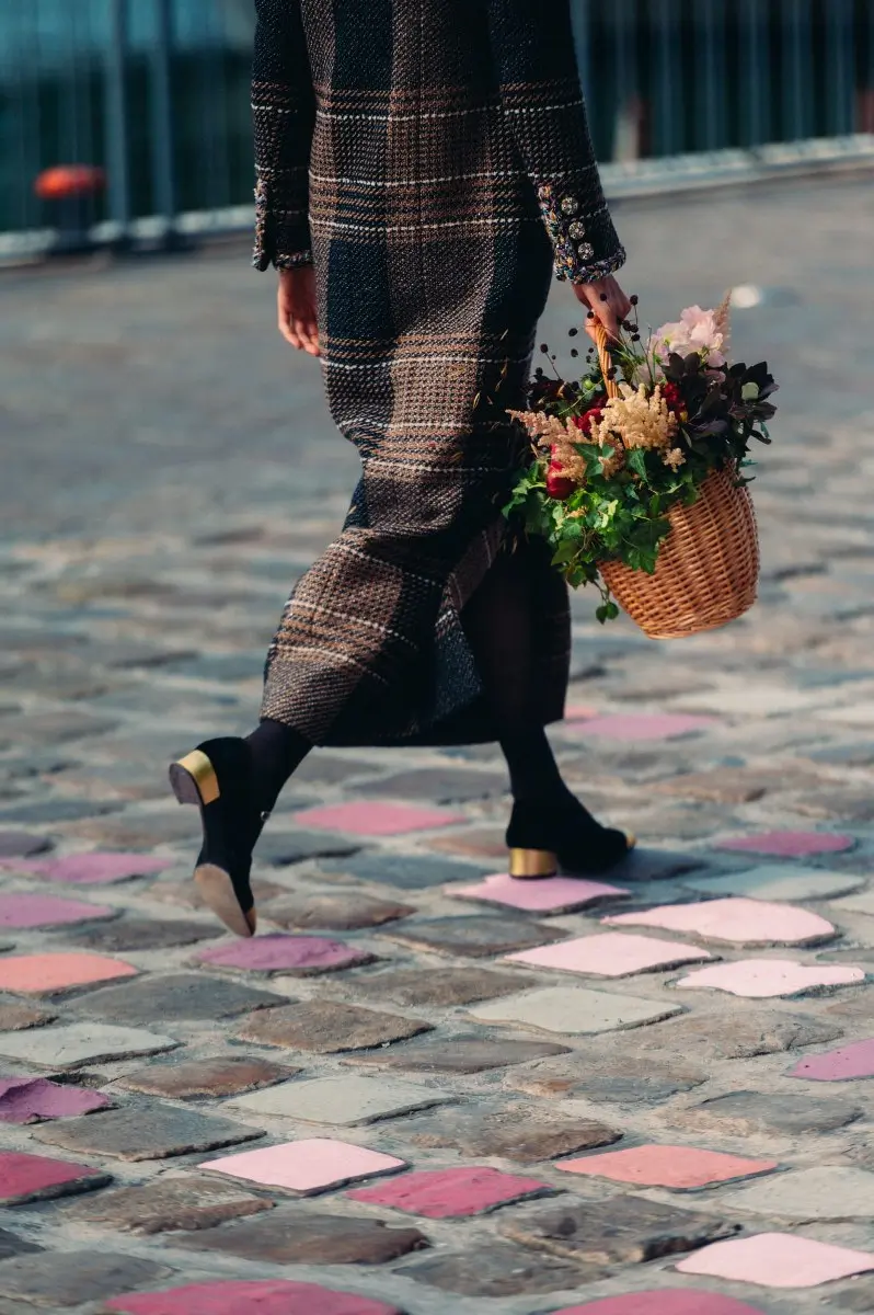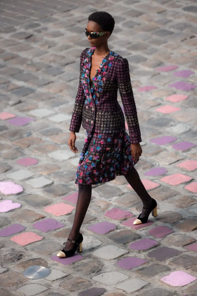 Reflecting a rich and feminine creative universe, the collection is a cornucopia of texture and silhouette, playing with tweeds, silk chiffons, organza and inlaid lace, along with a blend of floral and graphic motifs. The collection’s street style, inspired by the colorful Parisian cobblestones, marries sophistication with simplicity, featuring masculine-inspired overcoats, diaphanous blouses, golden tweed skirts, and vibrant two-tone Mary-Janes. With this collection, Virginie Viard continues to redefine CHANEL’s codes through a unique blend of rigour and asymmetry, subtle hues and vibrant shades, confidence and discretion, all while celebrating the brand’s commitment to dream and inspire.