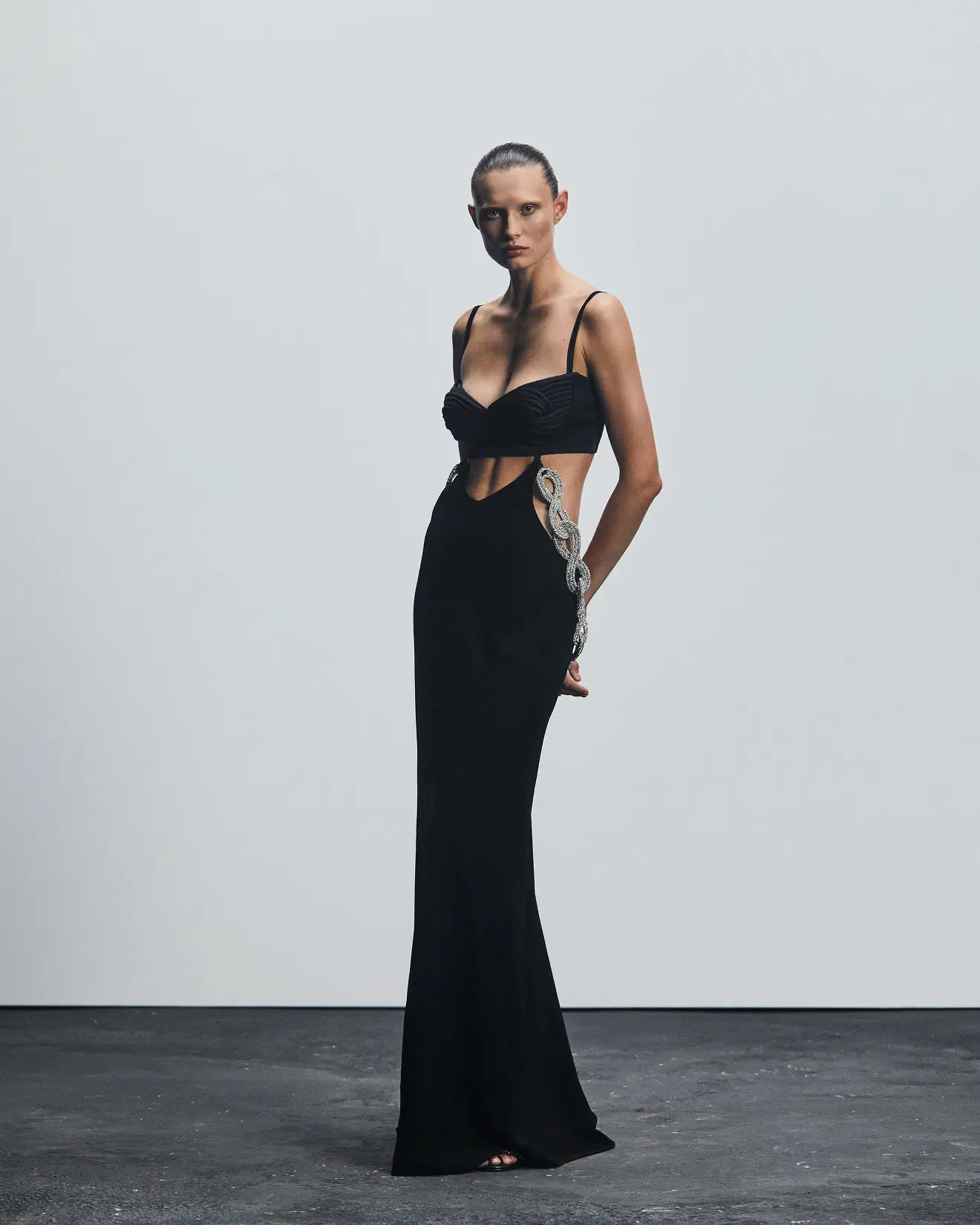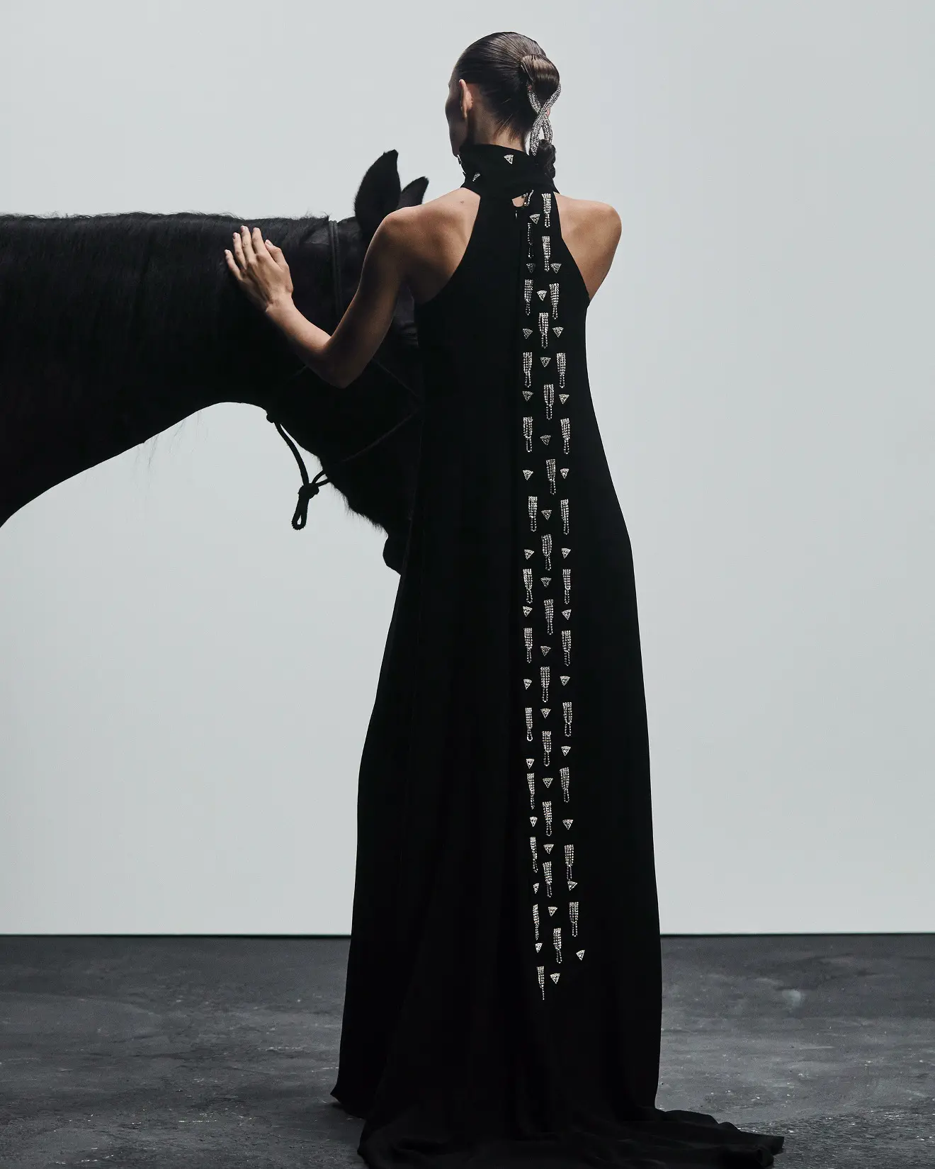 Deep-rooted Ukrainian motifs naturally inspired the collection as well. Elvira Gasanova reworked the embroidery on a traditional garment named “vyshyvanka” in her own radiant way – by putting delicate crystals on voluminous sleeves of black gown. The other national code that was elegantly woven into the GASANOVA collection is the braid. Glittering braid decorates the shoulders or the neckline or frames the tender cut-out of the dress front. This element symbolizes the connection of the three family generations as the designer always values sisterhood and the power of unity.
