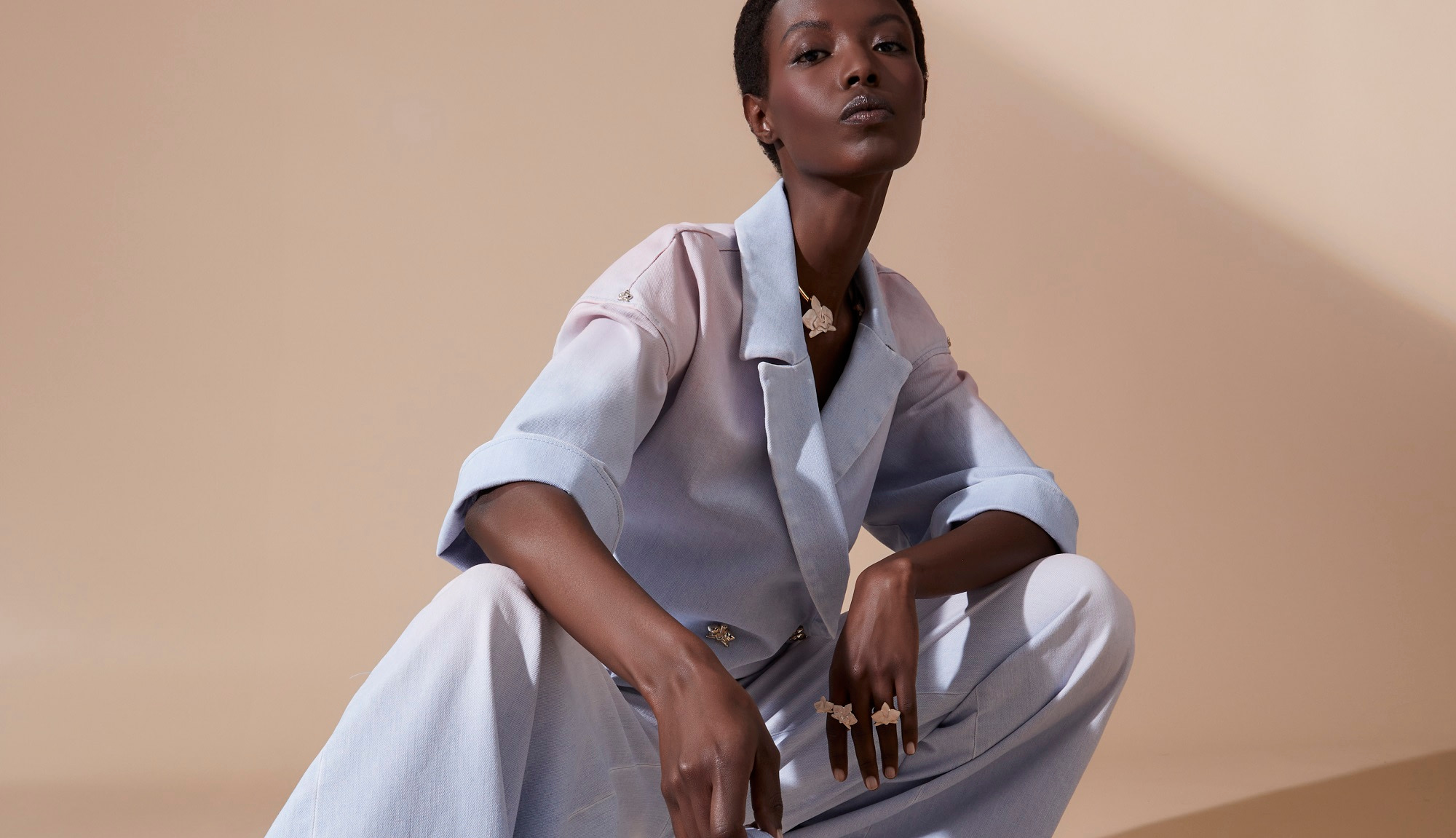 Genny’s signature style is refined through precise material and chromatic choices, resulting in a collection that epitomizes femininity in its purest form. The palette, a graceful journey from quintessential white to subtle nudes, tender salmon pinks, serene light blues, and classic black, sets the stage for a symphony of fluid lines and sensual silhouettes. Georgette dresses flow with an ethereal grace, while unexpected volumes and plissé details infuse a modern dynamism.