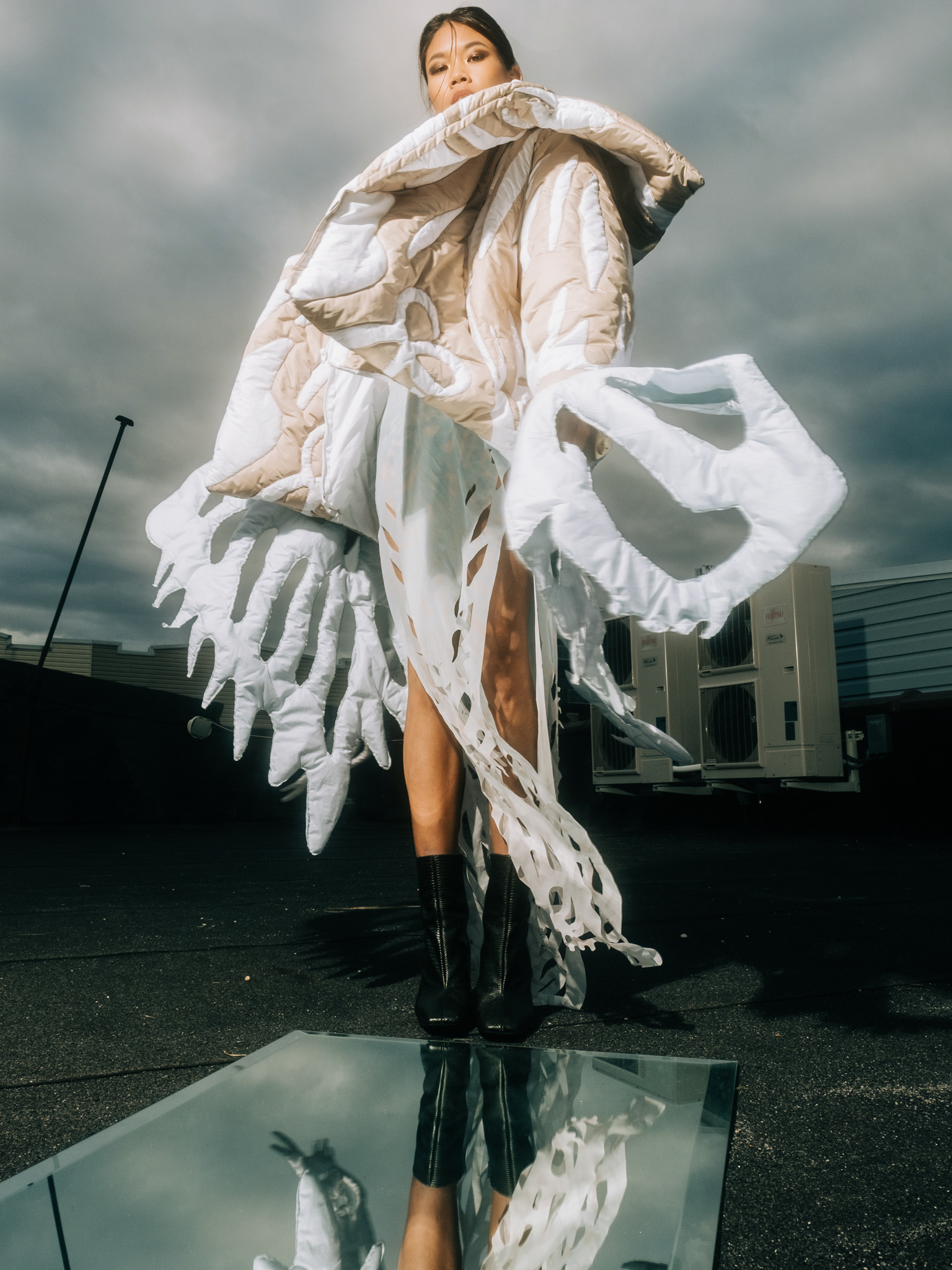 Sourcing inspiration from an exploration of nature versus nurture (Nature: Tina Ma’s great-great grandmother’s traditional Chinese paper cuttings; Nurture: the technological transformations of these visual references). The final result of TINA MA’s “Phenotypic Plasticity 01” collection was solidified by its own construction process. The collections integrated New York-based Singaporean designer, Tina Ma’s heritage and ancestral appreciation for craftsmanship with contemporary methodologies such as 3D virtual design, digital printing, and laser cutting.