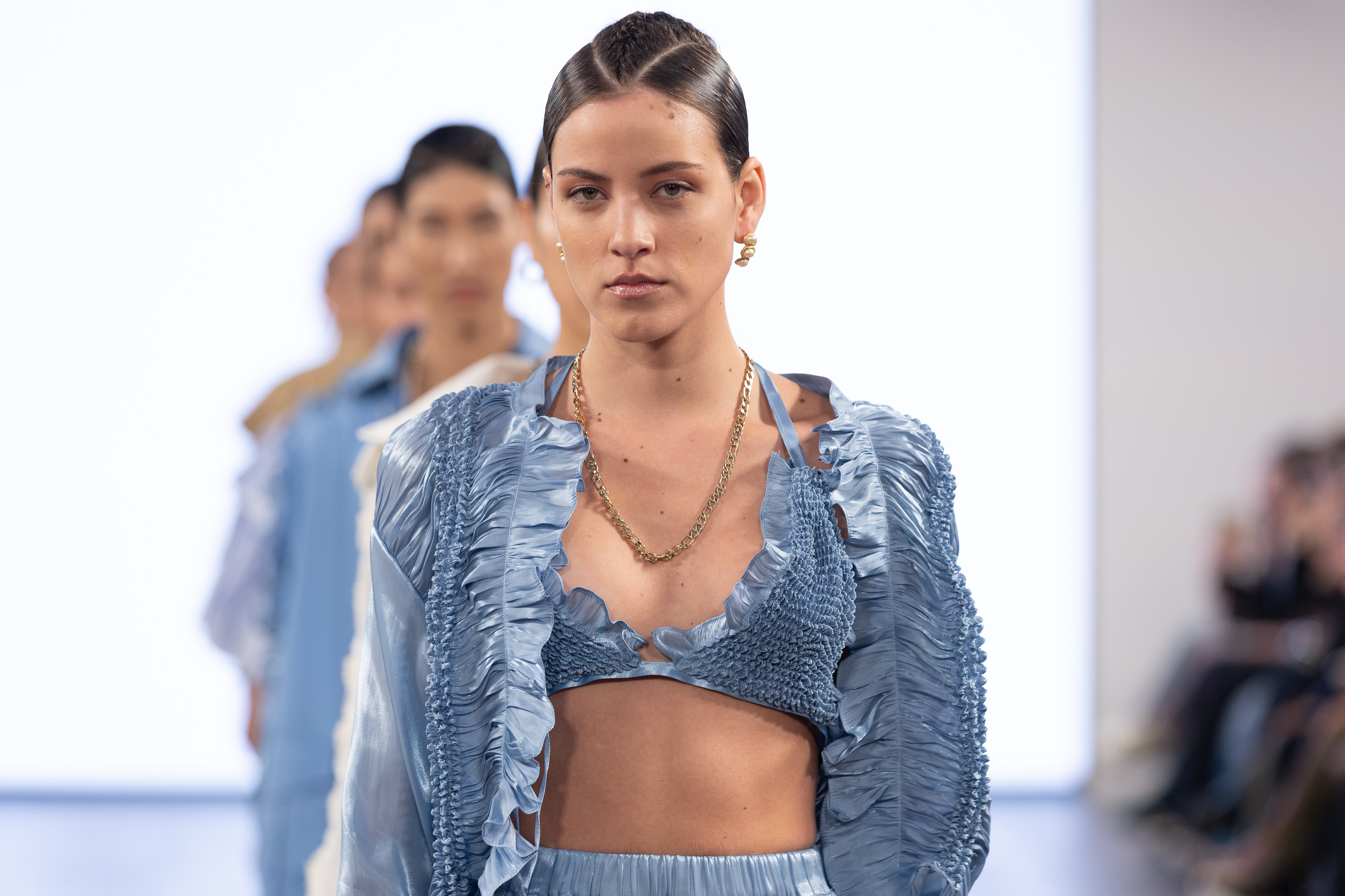 One of the highlights of London Fashion Week SS24 was the on-schedule debut of designer Jun Nakamura’s semi-eponymous label JU-NNA, whose latest collection showed in front of a packed East London audience comprising industry insiders, celebrities and in-the-know fashion fans. The air of expectation and anticipation outside the venue was palpable, and there was a tangible sense that his previous off-schedule show at the same venue had laid the groundwork for a word-of-mouth buzz which saw massive queues snaking down a Shoreditch Street.