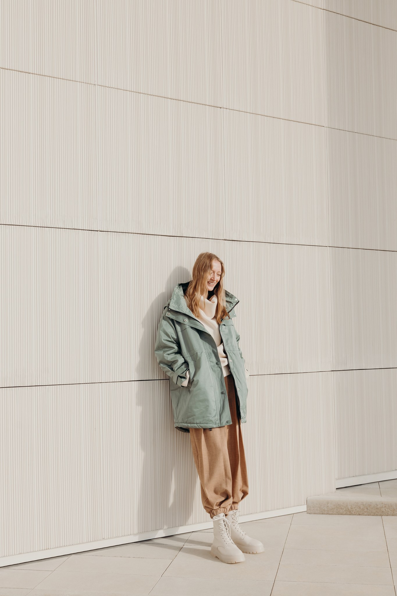 Young woman in a white top leans on a textured wall in an urban setting.