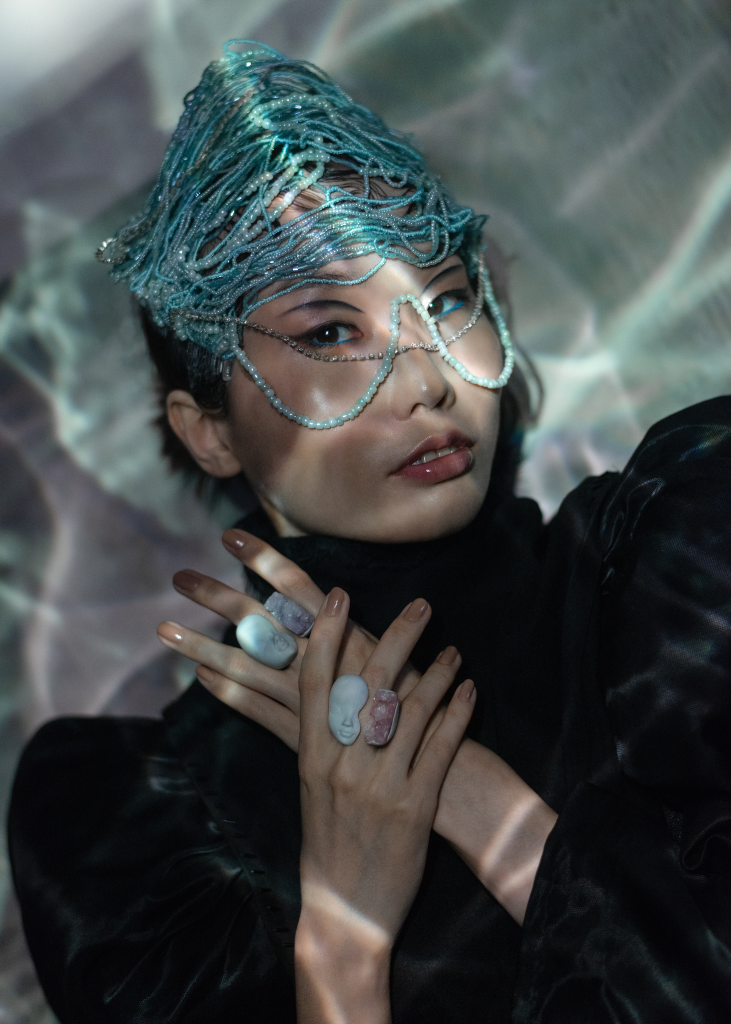 Mysterious woman in gothic attire with chain headdress and dramatic lighting.