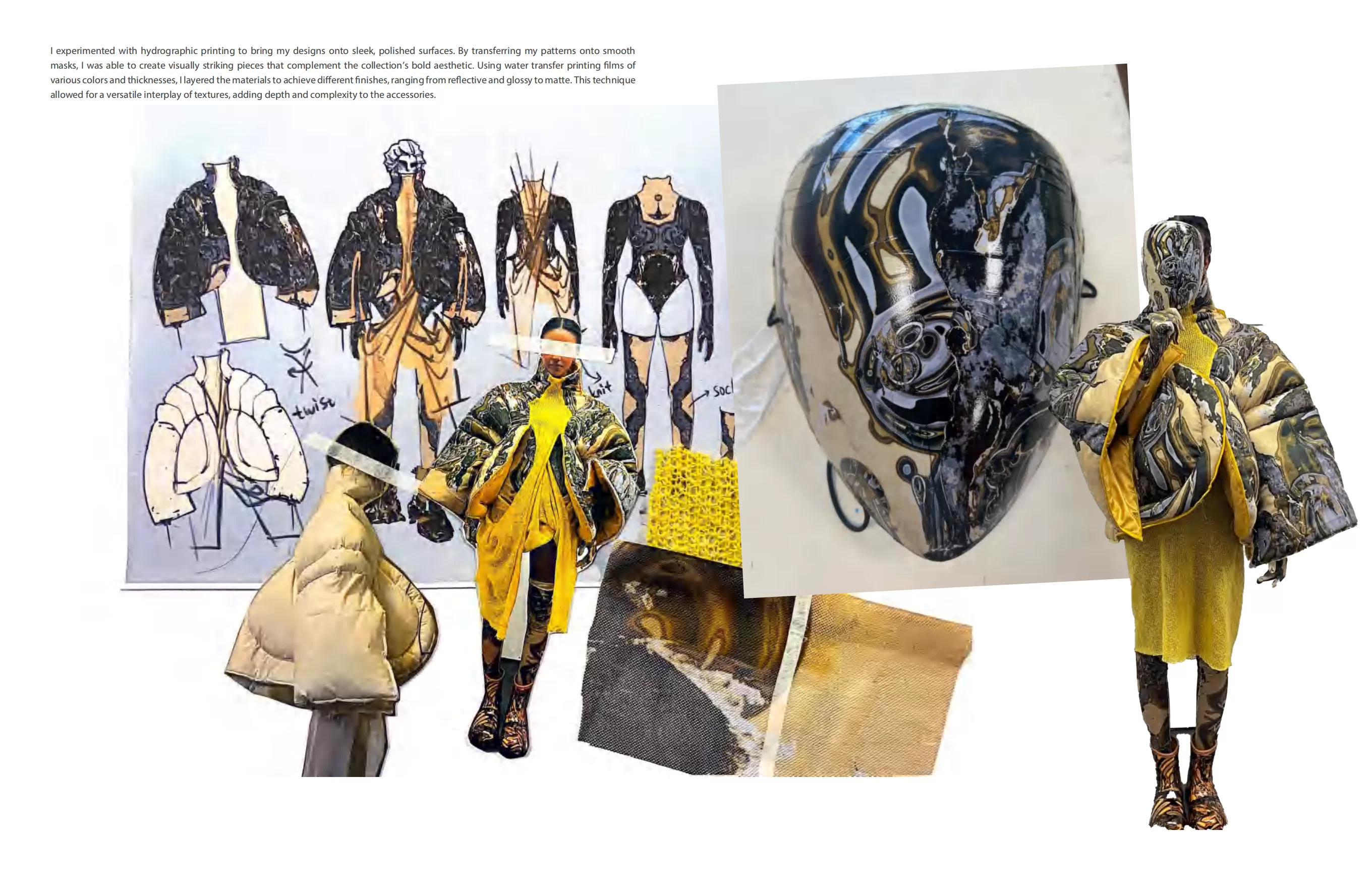 Echo Wanderer started by creating a program in TouchDesigner that generates visual patterns from music. I used projection mapping to place these patterns on mannequins. This helped me see how the prints fit with the shape of the garments. For the production, I used digital printing and water transfer to apply the patterns to the fabric. I also made a series of accessories that matched the same visual style. To add more texture and depth, I used padded fabrics and applied quilting along the organic, flowing lines of the prints.