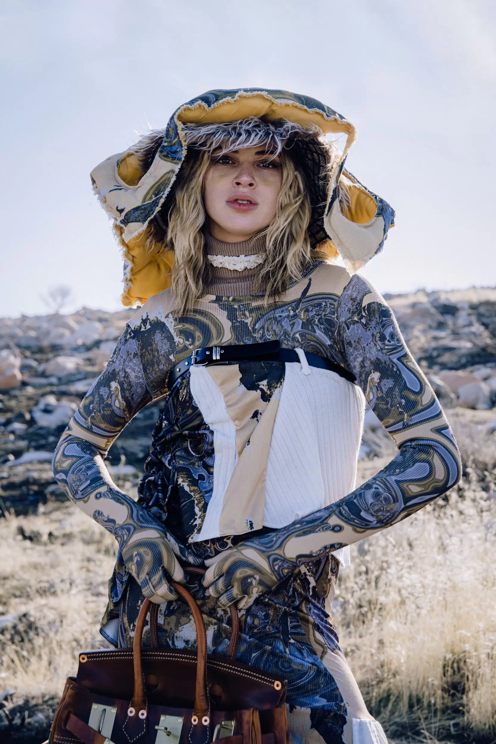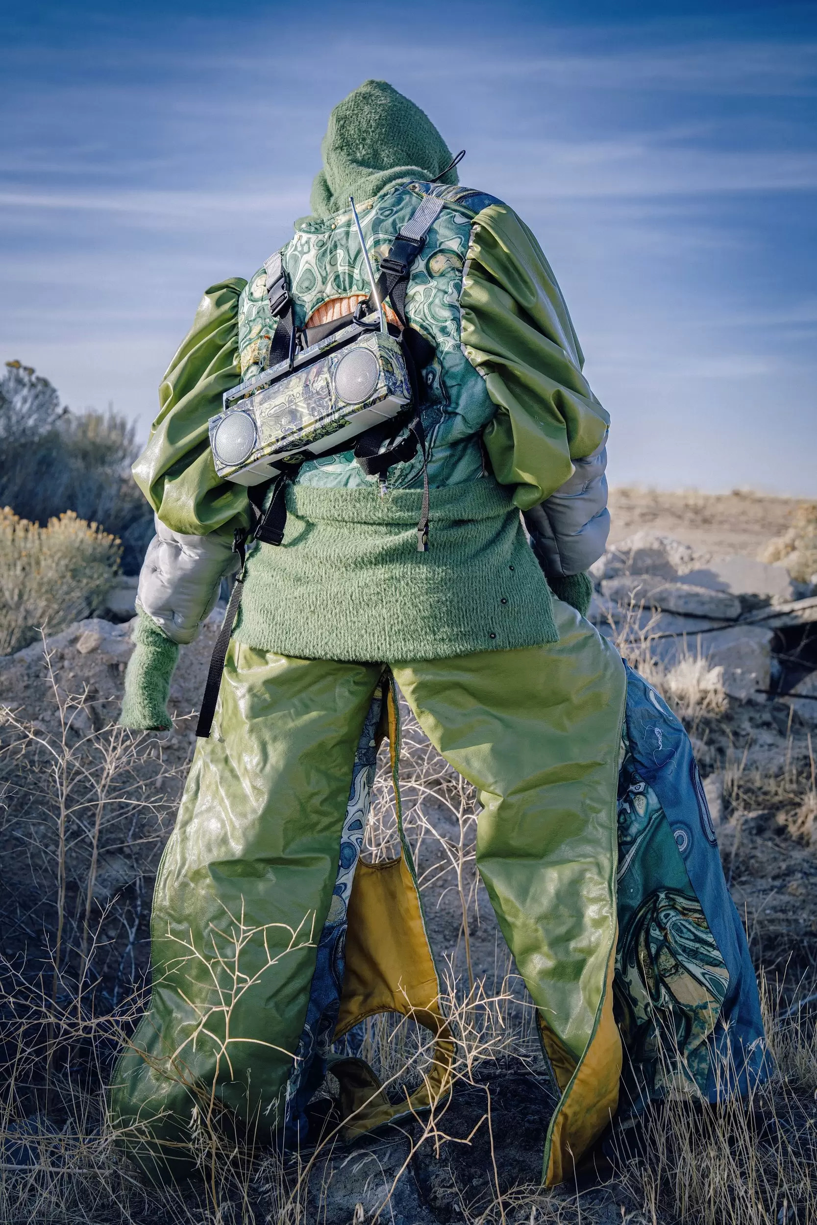 I wanted to bring that feeling of freedom and sound into my design. I created the program that turns melodies and rhythms into patterns, using themes prints for the collection. To capture the sense of movement and calm, I chose mudflats with large rocks as the backdrop to reflect the idea of wandering in open spaces. The models read books in this quiet, wild setting, adding a peaceful and poetic feeling to the scene——almost like a story from another planet.