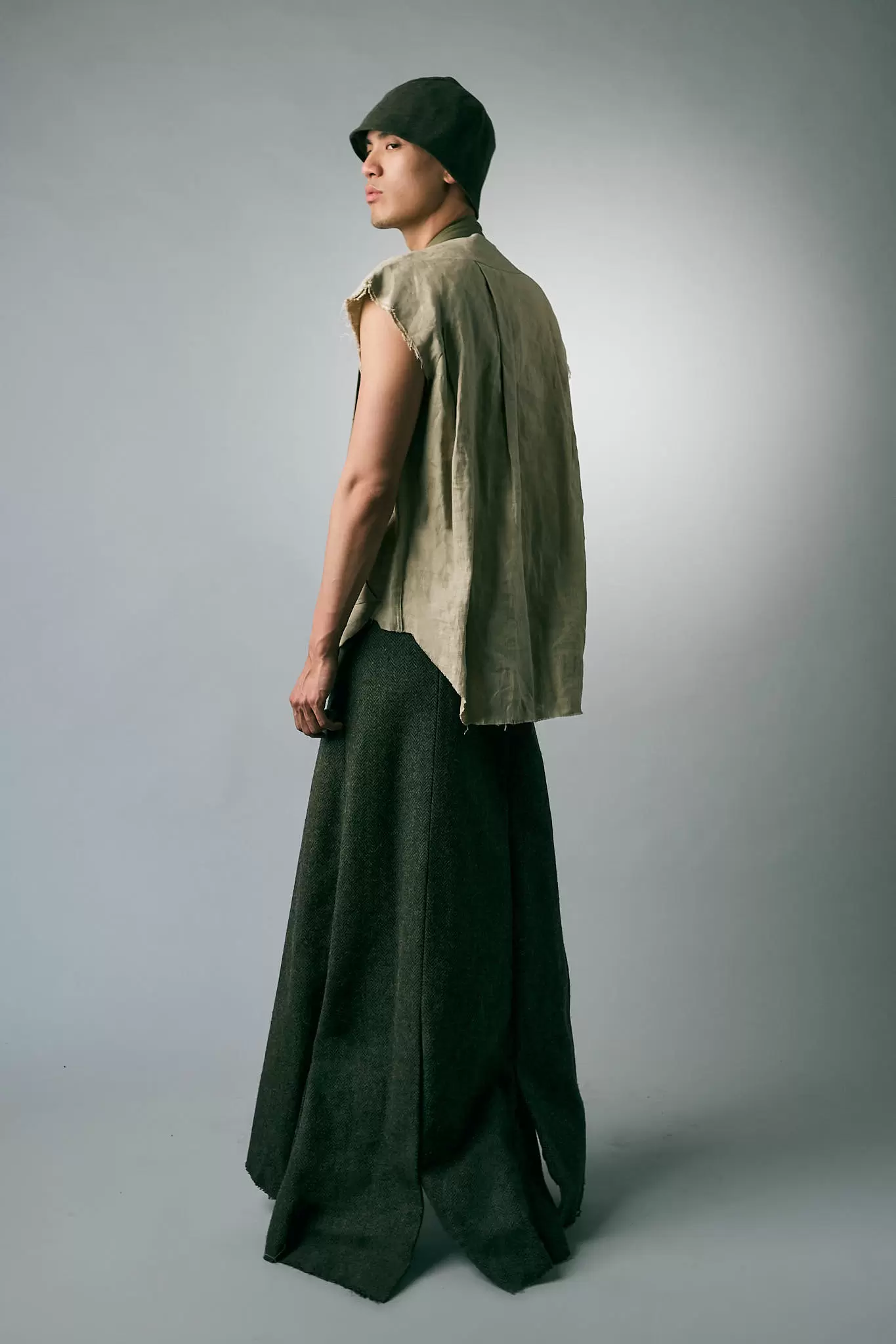 Huang shoots spare and precise. Light brushes the clothes, then slips away, inviting small shifts in posture to carry the frame. The images feel quiet at first, then layered. A tilt of the head, a hand at the collar, a step that pulls the skirt back to reveal weight and grain. You read them the way you read an old garment — by touch.