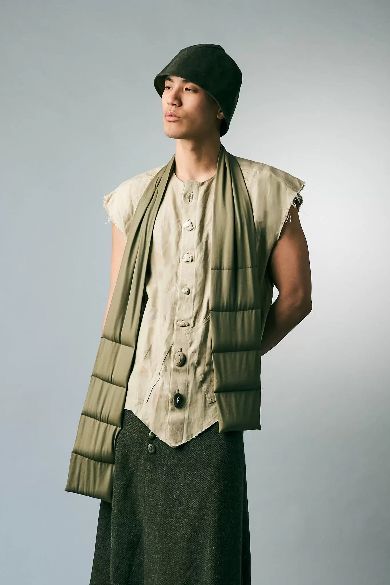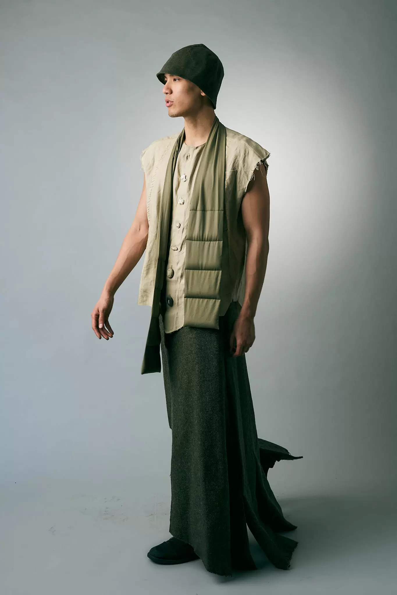 Memory leaves marks. Some are visible in worn hems and softened fabric. Others sit underneath, shaping how we move. “Recall” works in that space. The styling leans into patina and structure: raw edges, quilted panels, long lines that fall to the floor. The palette stays close to earth and stone, letting the cuts do the talking.