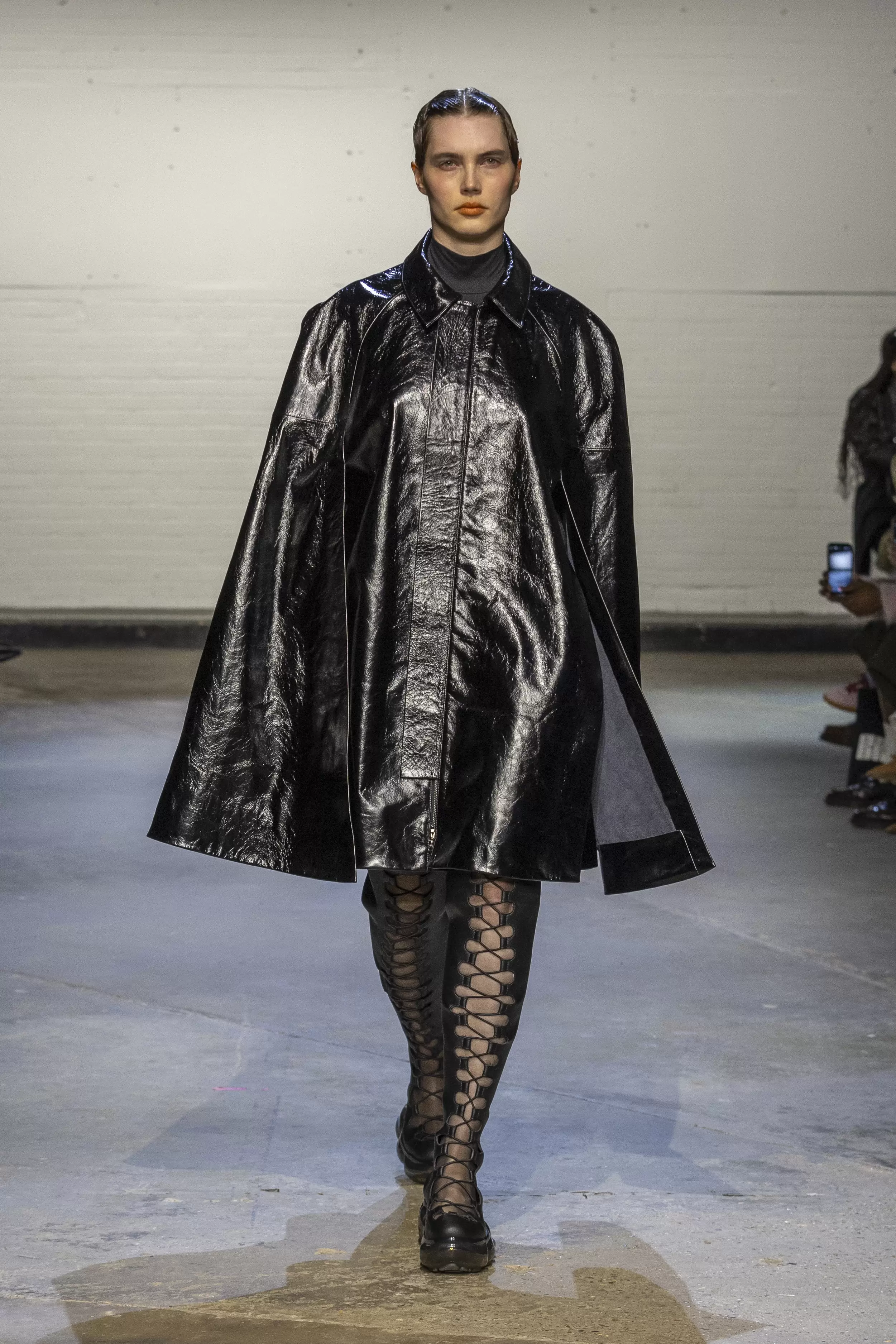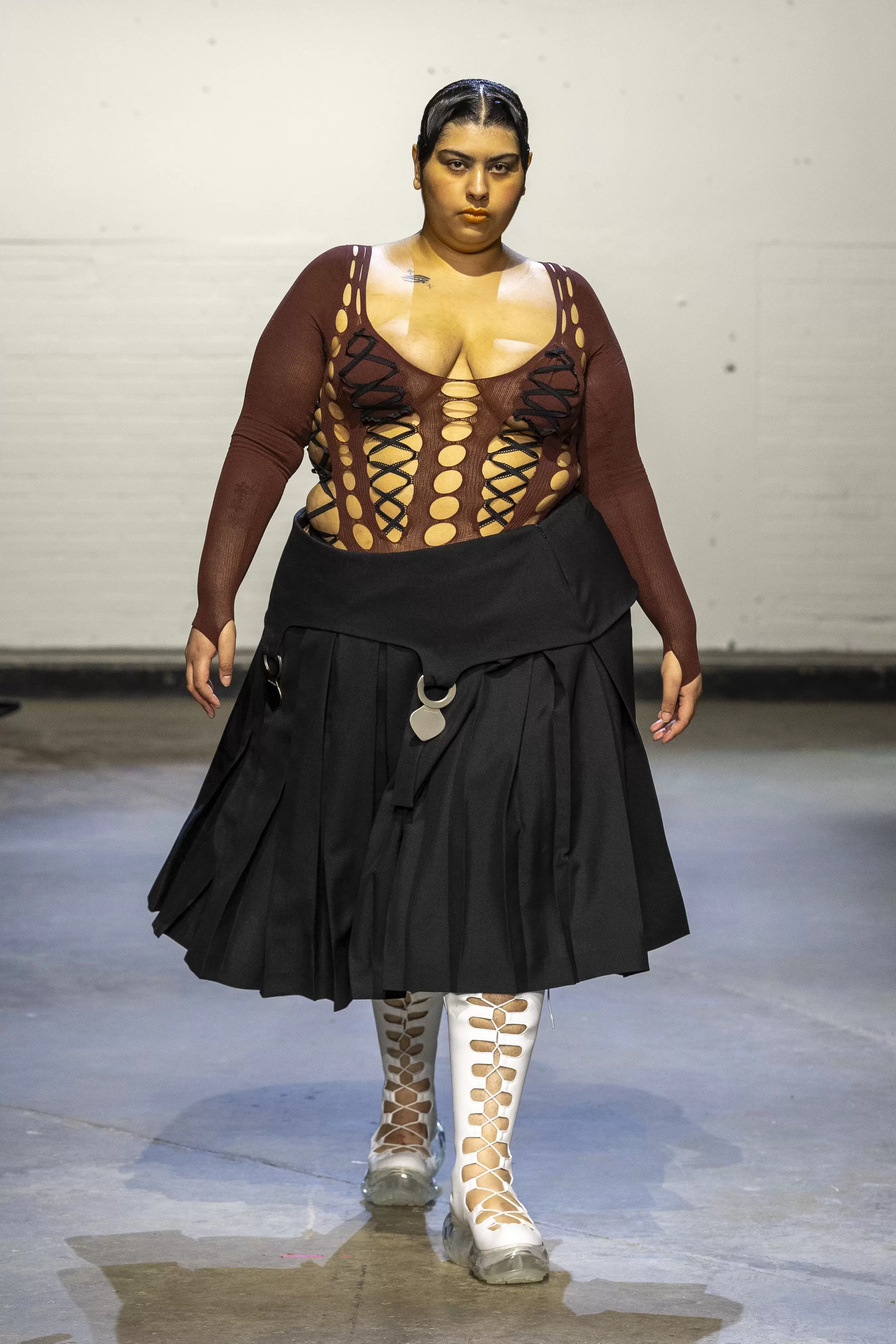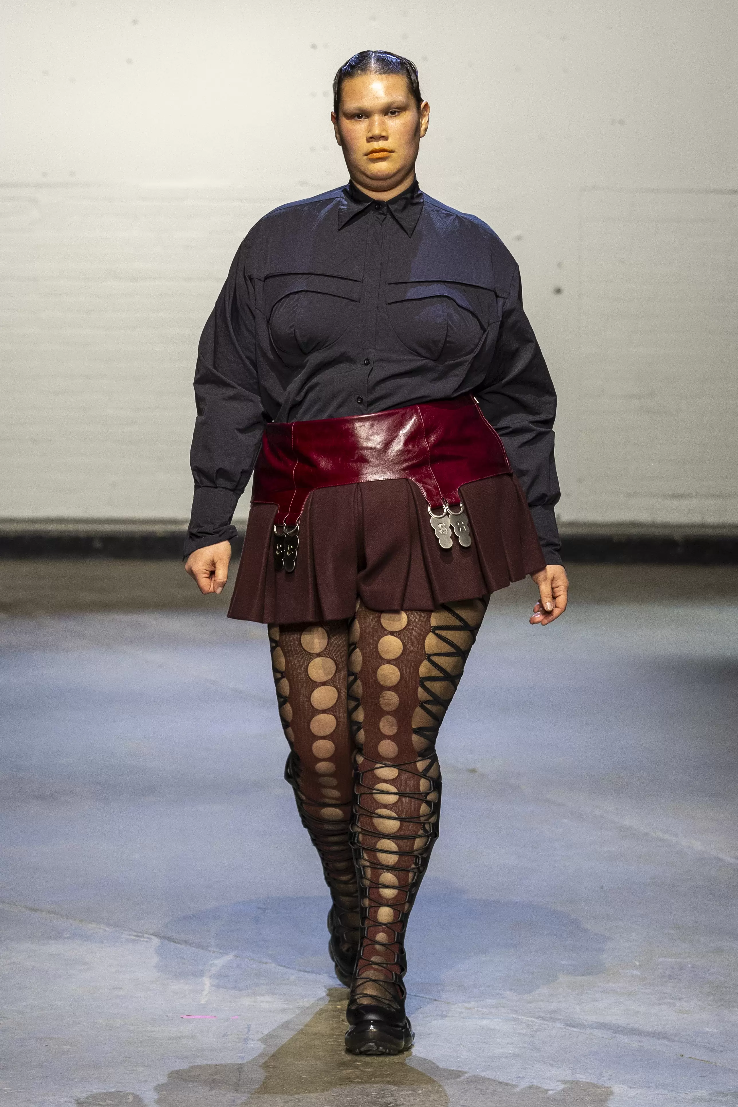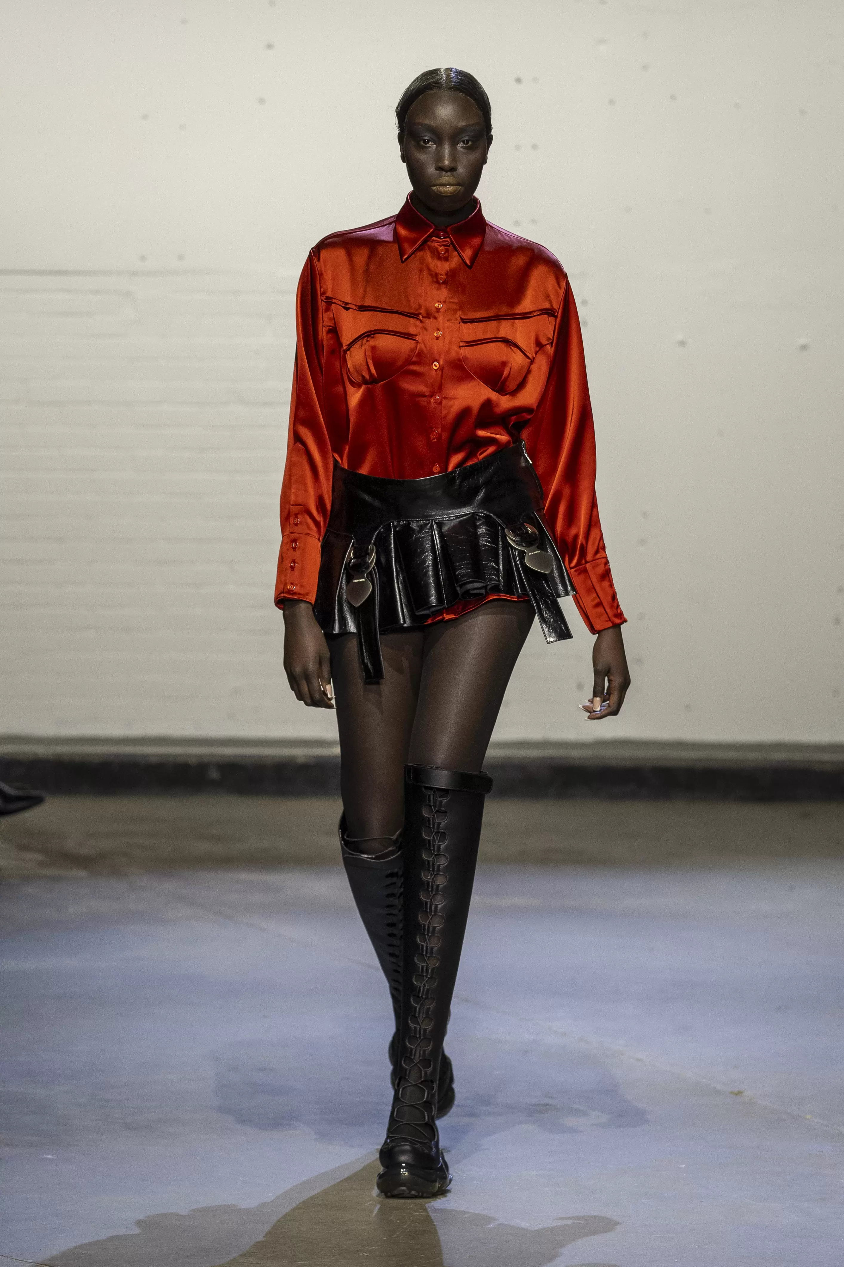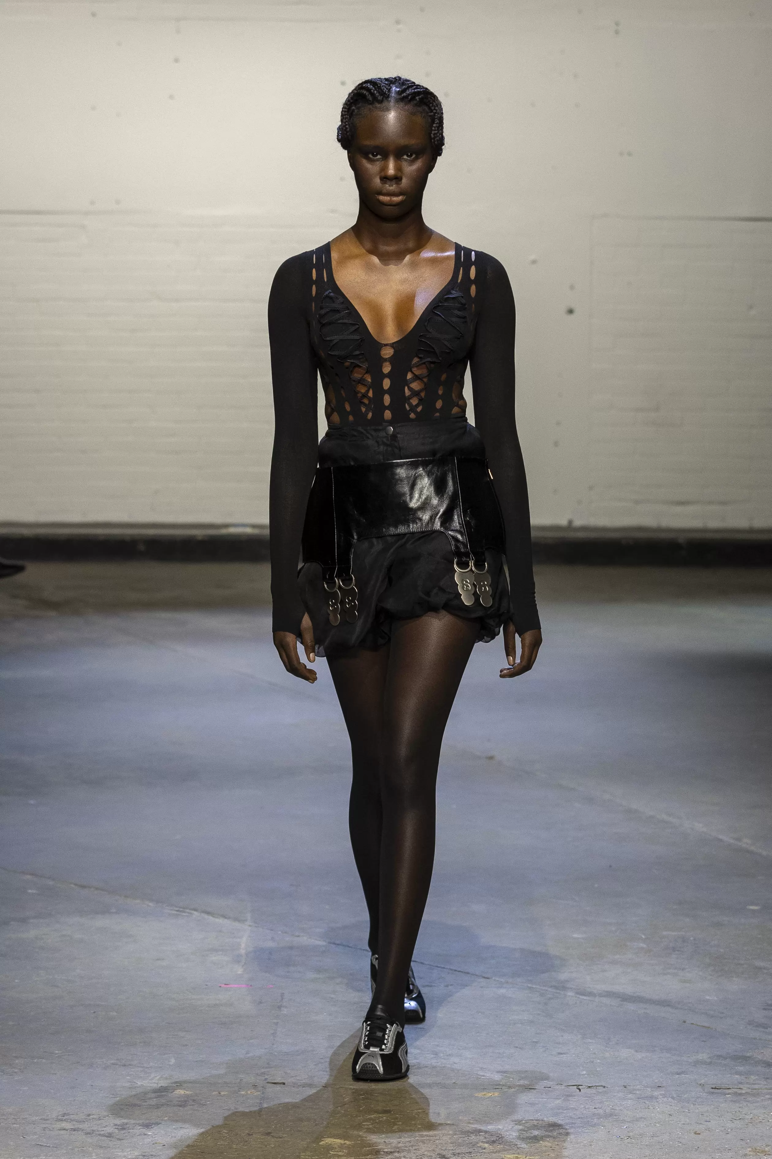 The first model strode onto the runway in a long black patent leather cape, followed by a series of tailored shirts, silk fabrics paired with leather, and deconstructed dresses, all house staples of uniform dressing fused with elements of erotica and sensuality. Building on the foundations laid by AW24’s Supervisor collection, AW25 further expanded the brand’s vocabulary. Double-breasted blazers were cinched at the stomach with leather bands, mesh boots climbed to the thighs, while bubble skirts, corset-style tops, and denim added to the collection’s depth. Many looks featured oversized metallic suspender clips that clinked with each step; pieces meant to be heard, reinforcing that the O’Dwyer wearer makes an entrance.