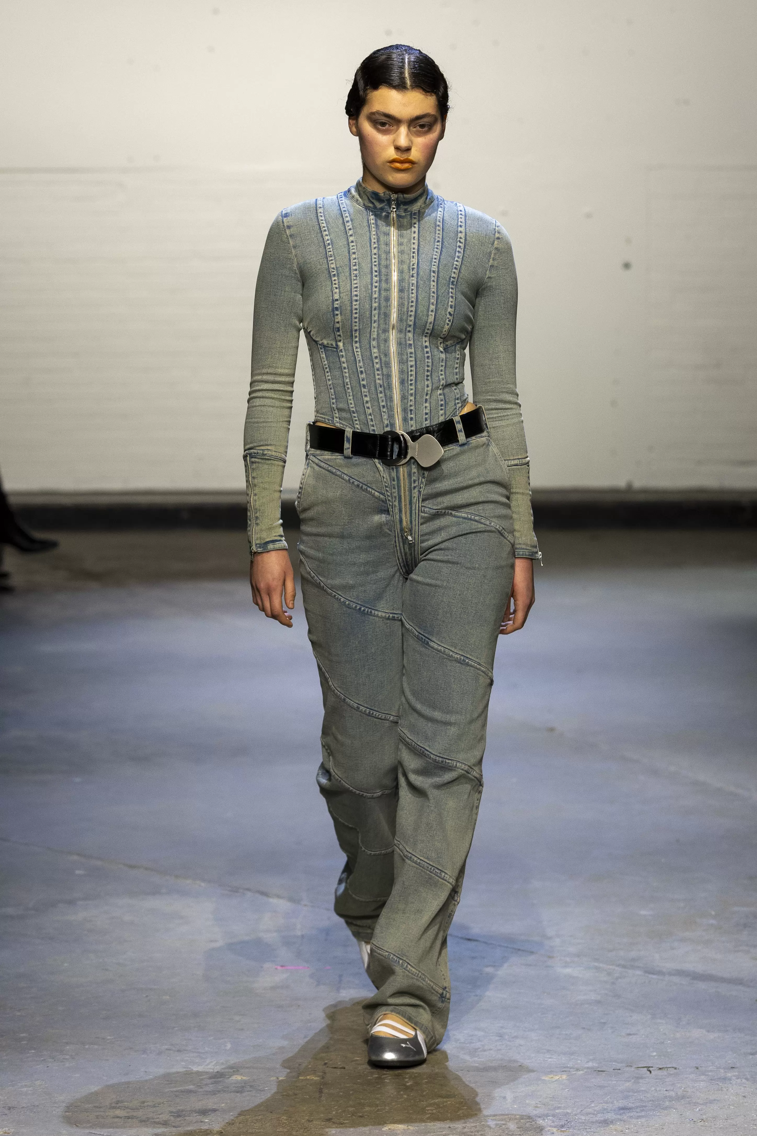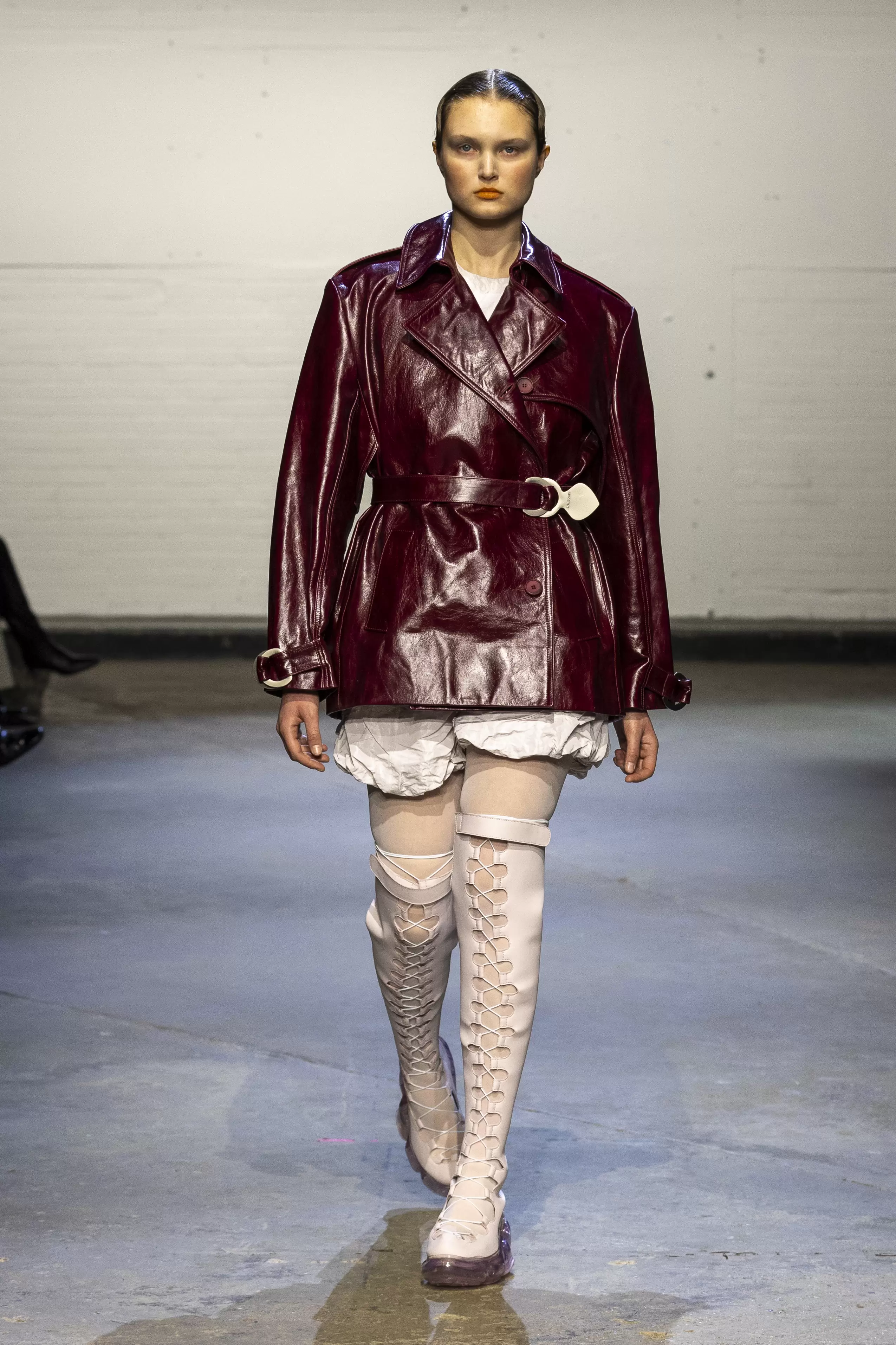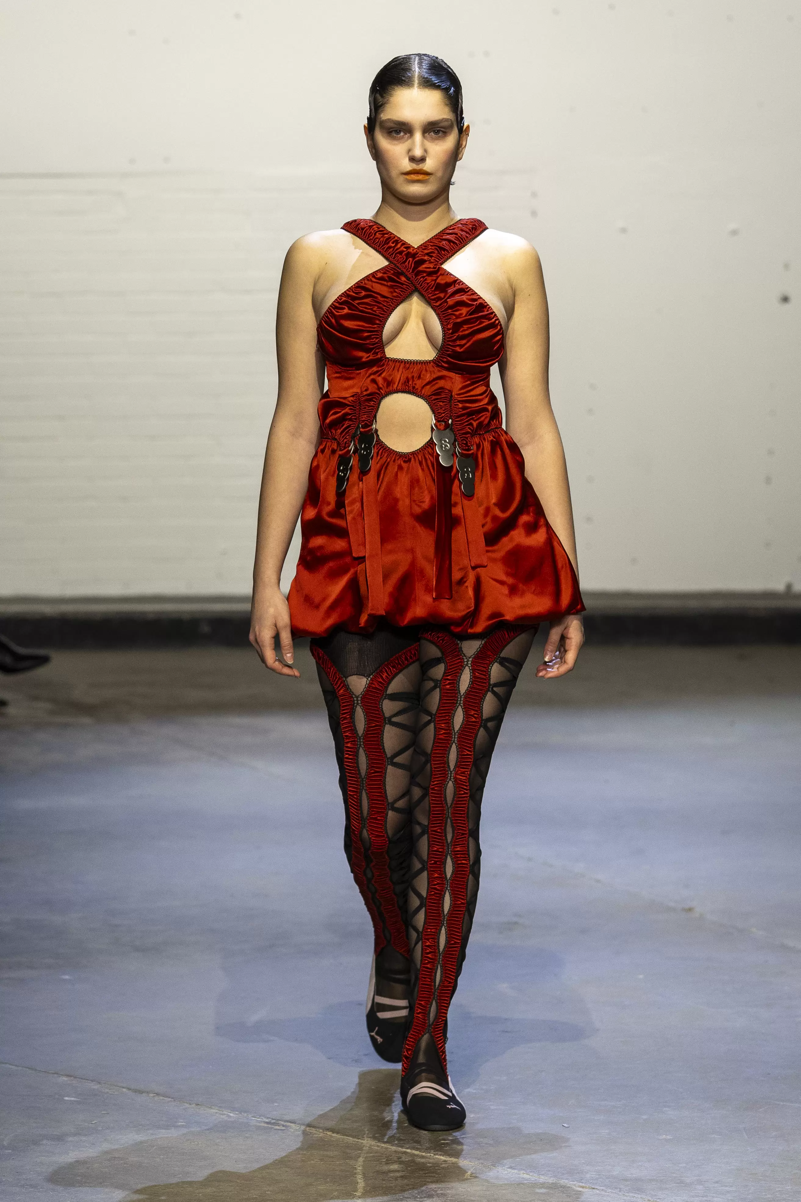 The collection evokes a raw, rebellious energy, blending elements of underground club culture and grunge. Gothic undertones also ran through the collection with a palette of oxblood, deep maroons, black, denim, and flashes of scarlet and teal. The influence of O’Dwyer’s Irish heritage was woven throughout. Lace-up details reminiscent of traditional Irish dance ghillies appeared not just on the footwear but garments themselves. A collaboration with Puma introduced athletic elements, bringing a modern twist, while a partnership with Grounds brought a Y2K influence through their reinterpretation of jelly shoes.