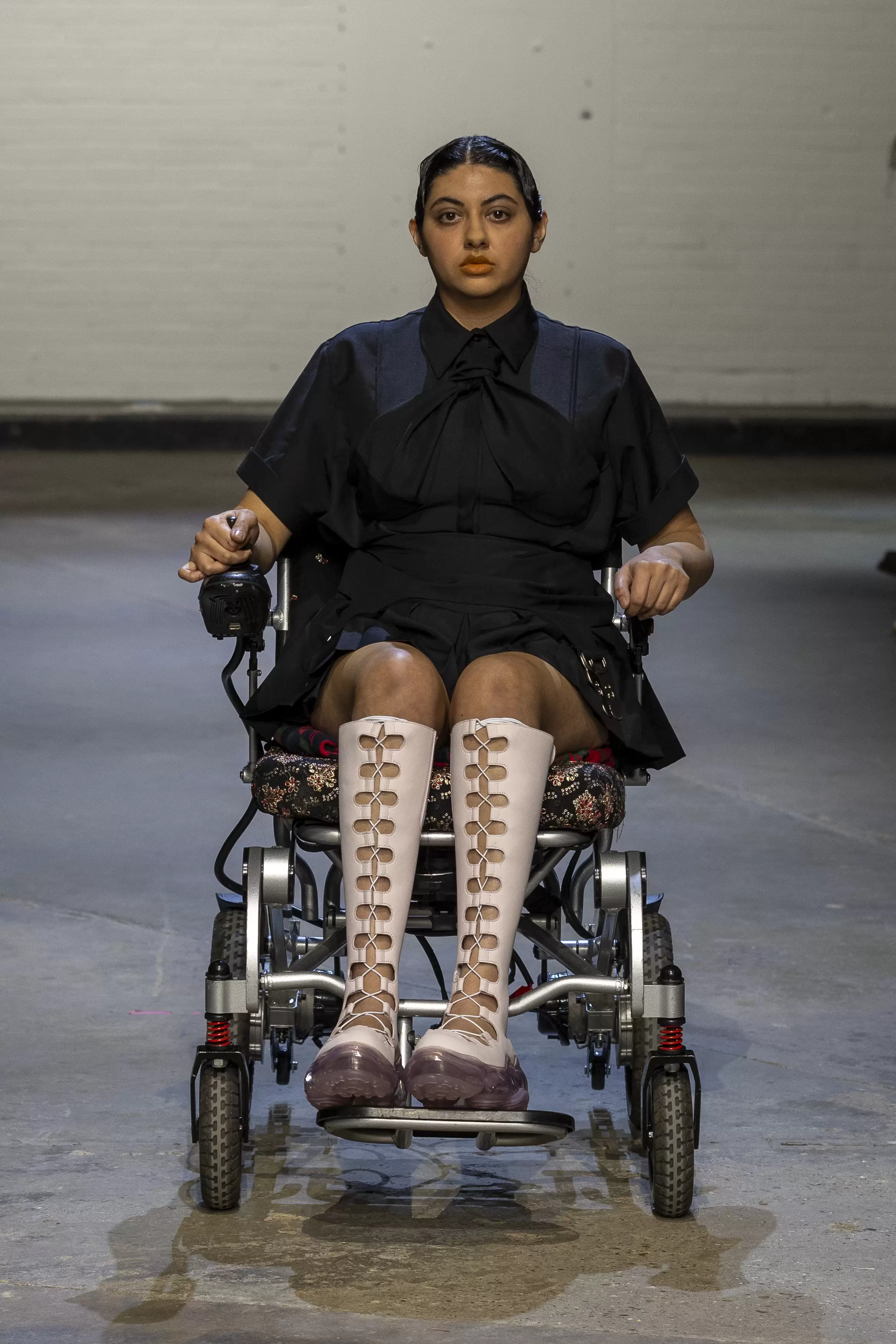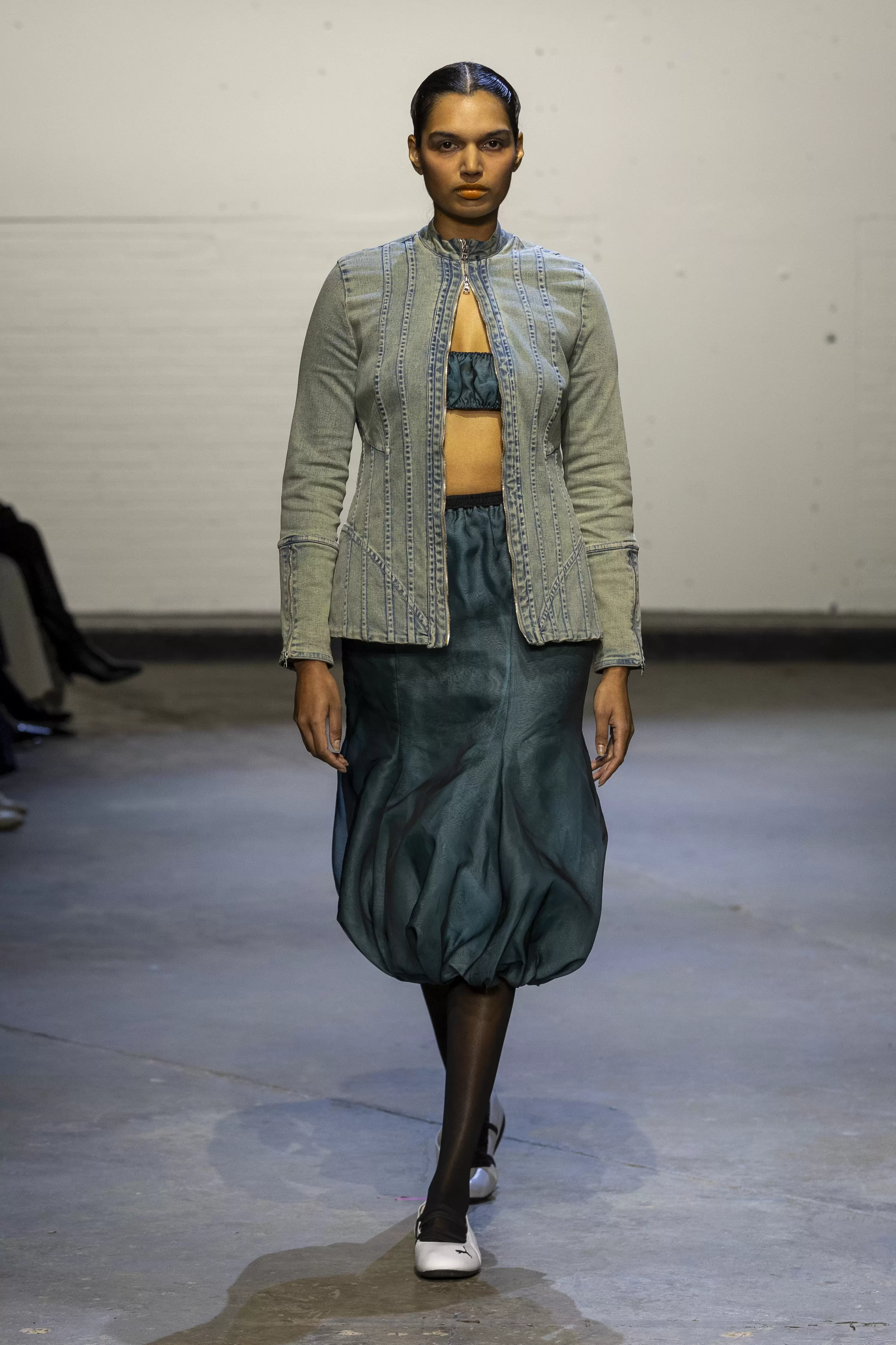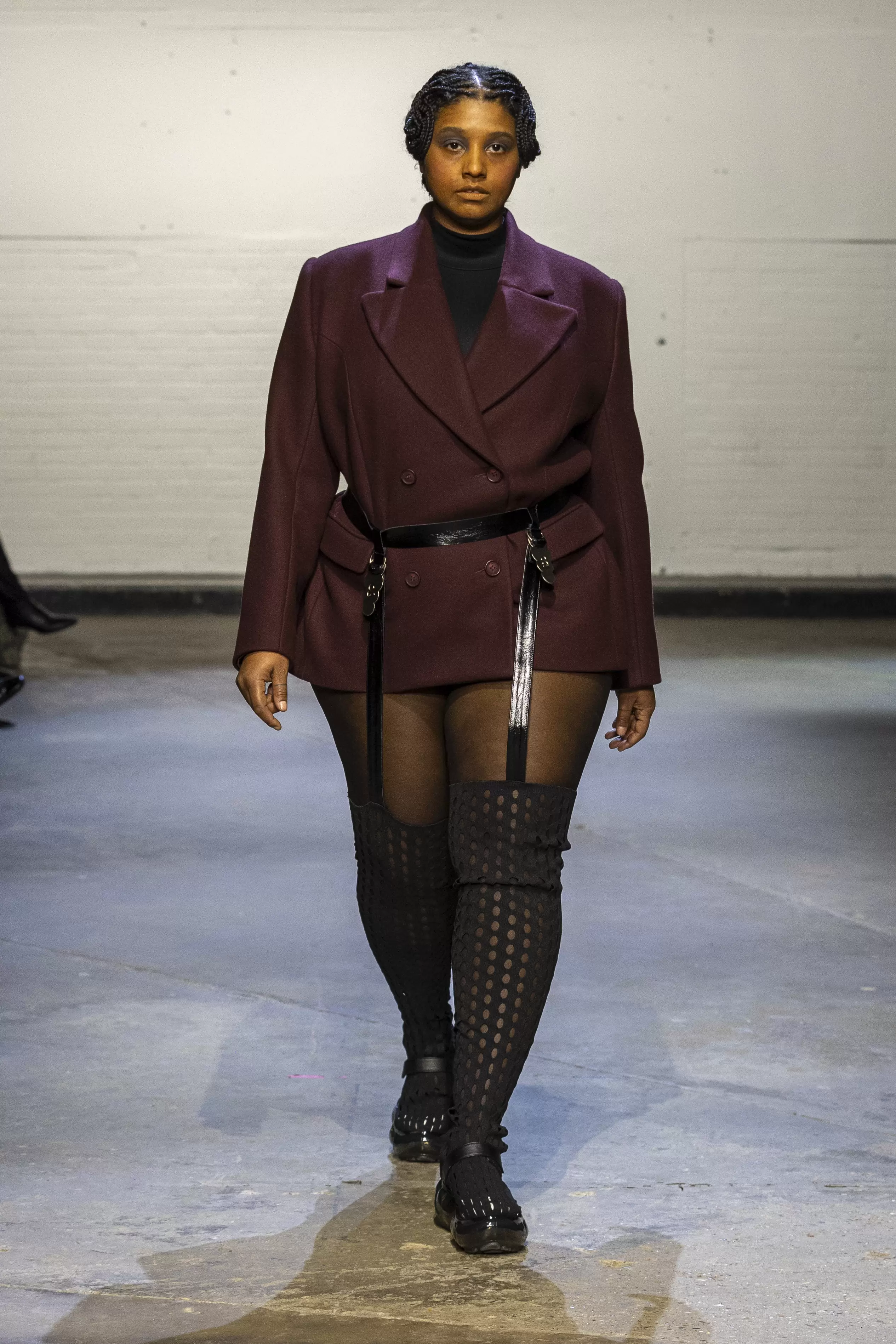 The collection evokes a raw, rebellious energy, blending elements of underground club culture and grunge. Gothic undertones also ran through the collection with a palette of oxblood, deep maroons, black, denim, and flashes of scarlet and teal. The influence of O’Dwyer’s Irish heritage was woven throughout. Lace-up details reminiscent of traditional Irish dance ghillies appeared not just on the footwear but garments themselves. A collaboration with Puma introduced athletic elements, bringing a modern twist, while a partnership with Grounds brought a Y2K influence through their reinterpretation of jelly shoes.