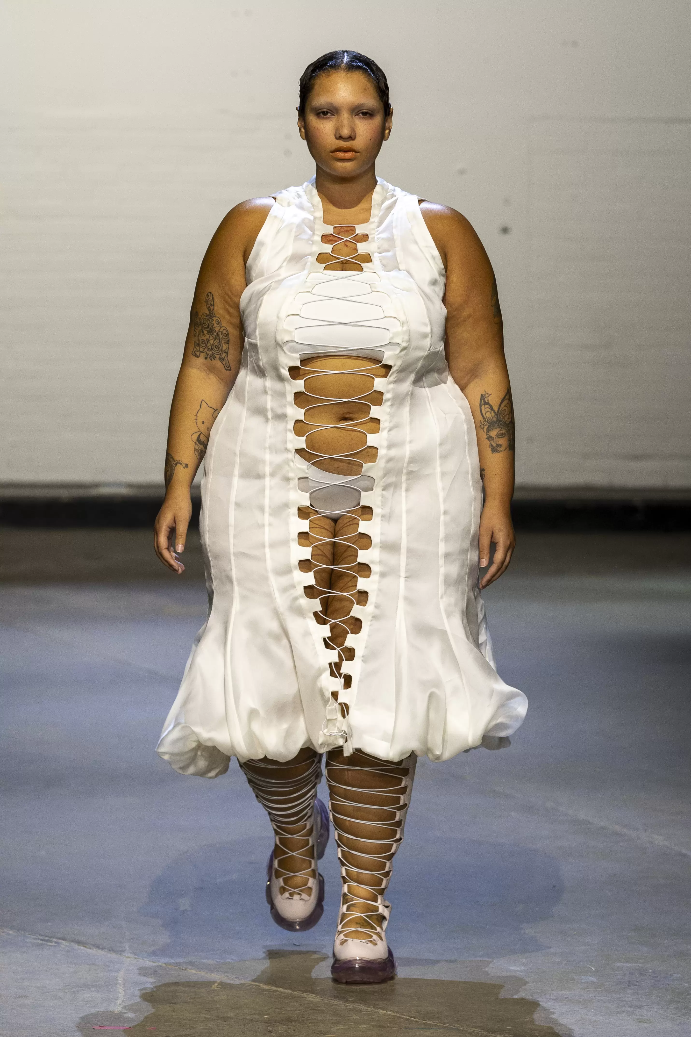 Rejecting fashion’s rigid body standards, O’Dwyer’s designs are neither overly concealed nor exposed, instead working with the natural lines of the body, celebrating movement and form. Layering, sheer fabrics, and intricate lace-up detailing reinforce the tension between vulnerability and strength. With inclusivity as a core pillar of her ethos, the designer has consistently challenged the industry’s narrow definitions of luxury, offering garments in sizes ranging from UK 4 to 30. This was evident in the diverse lineup of models, spanning a range of sizes, ethnicities, and abilities, circling the runway. It is clear that this is not an exercise in performative inclusion but a true reflection of her vision.