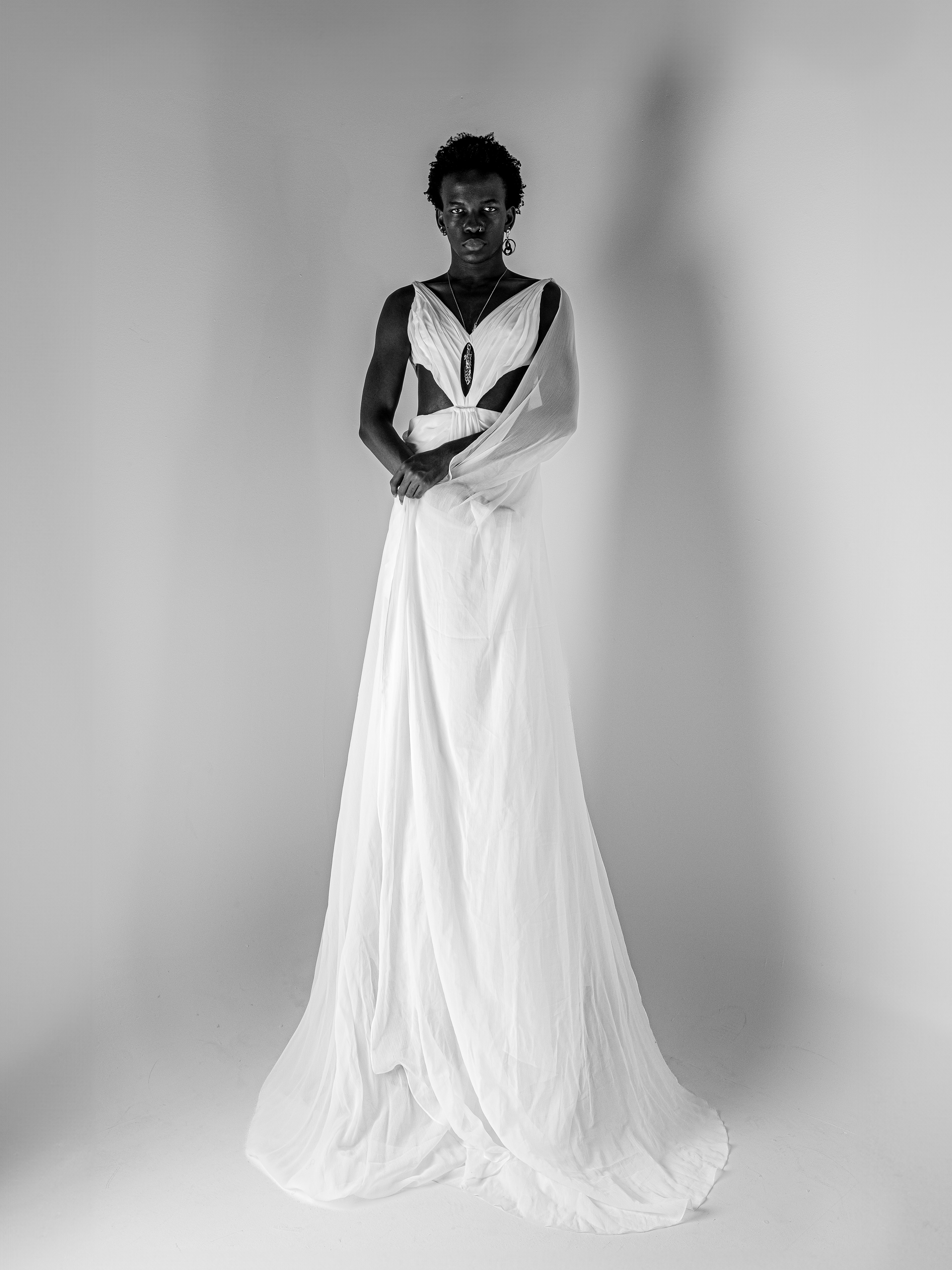 One of the standout garments from this collection is “Theija,” a white silk chiffon gown from Mann’s Sophisticate collection. “Theija” features a soft, flowing drape paired with a bold cape detail, combining a sense of grace with undeniable strength. Mann herself describes the gown as a symbol of freedom, a design that speaks to the atelier’s mission of transcending conventional fashion norms. Although it can be customized in any color, the white version used in the shoot highlights the purity of the message behind the design: individuality without boundaries. The way the gown moves, especially with the cape’s ethereal presence, echoes Mann’s commitment to creating pieces that empower the wearer while maintaining a refined elegance.