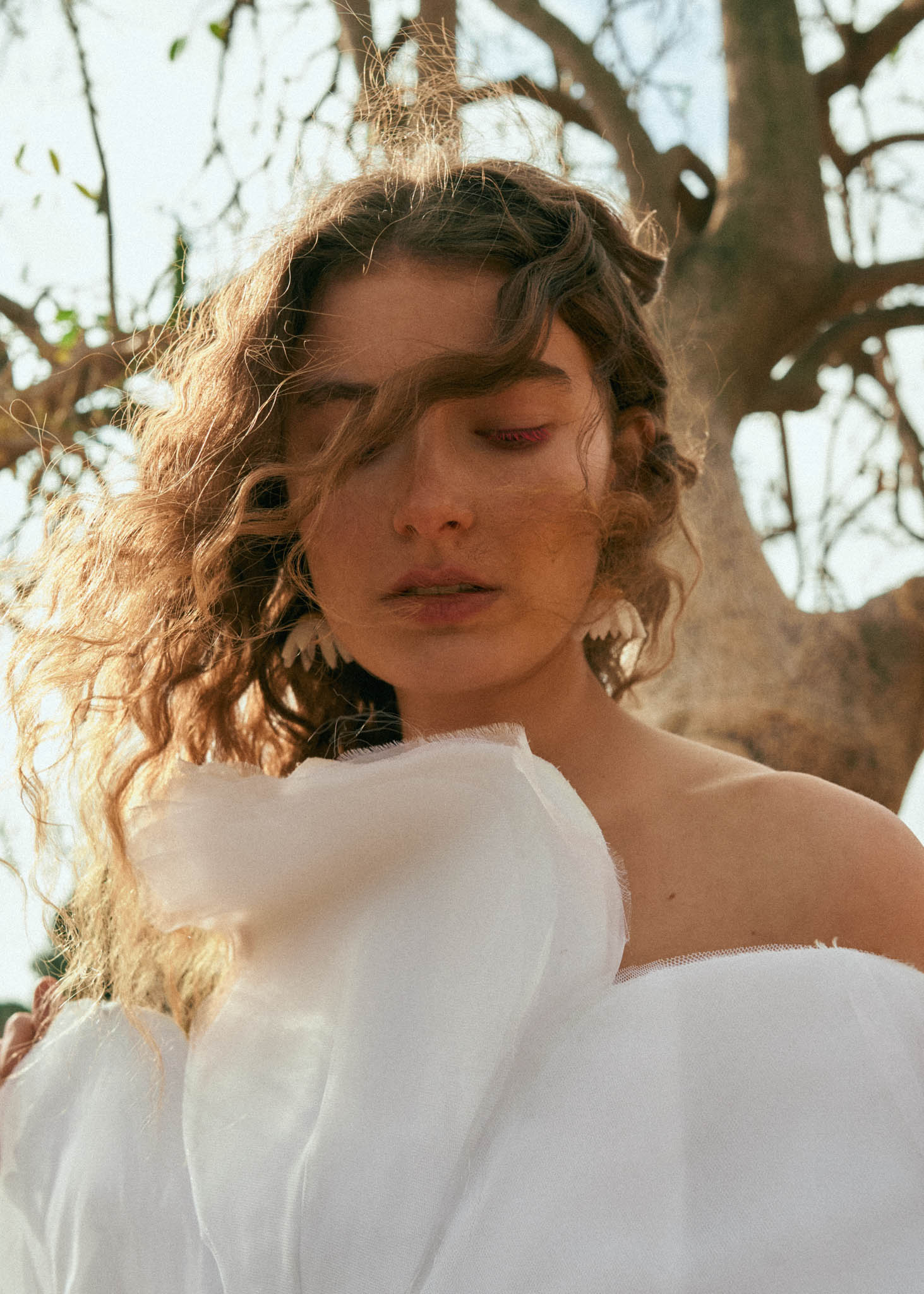 Elegant woman with artistic hairstyle and soft makeup, gazing downwards.
