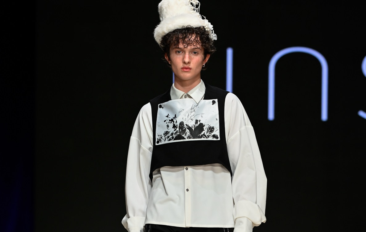 Coming all the way from Tokyo, Unserten, an avant-garde menswear brand founded in 2020, had made a huge and positive impact at Vancouver Fashion Week on Day 3 of the event. Within a multitude of monochromatic pieces, the collection’s strong presence was also seen in the crowd, Riverdale’s Drew Ray Tanner who wore a magnificent coat. The pieces embodied gothic simplicity, gender-neutral style and lines and a mix of soft ribbons and silver metallic chains.