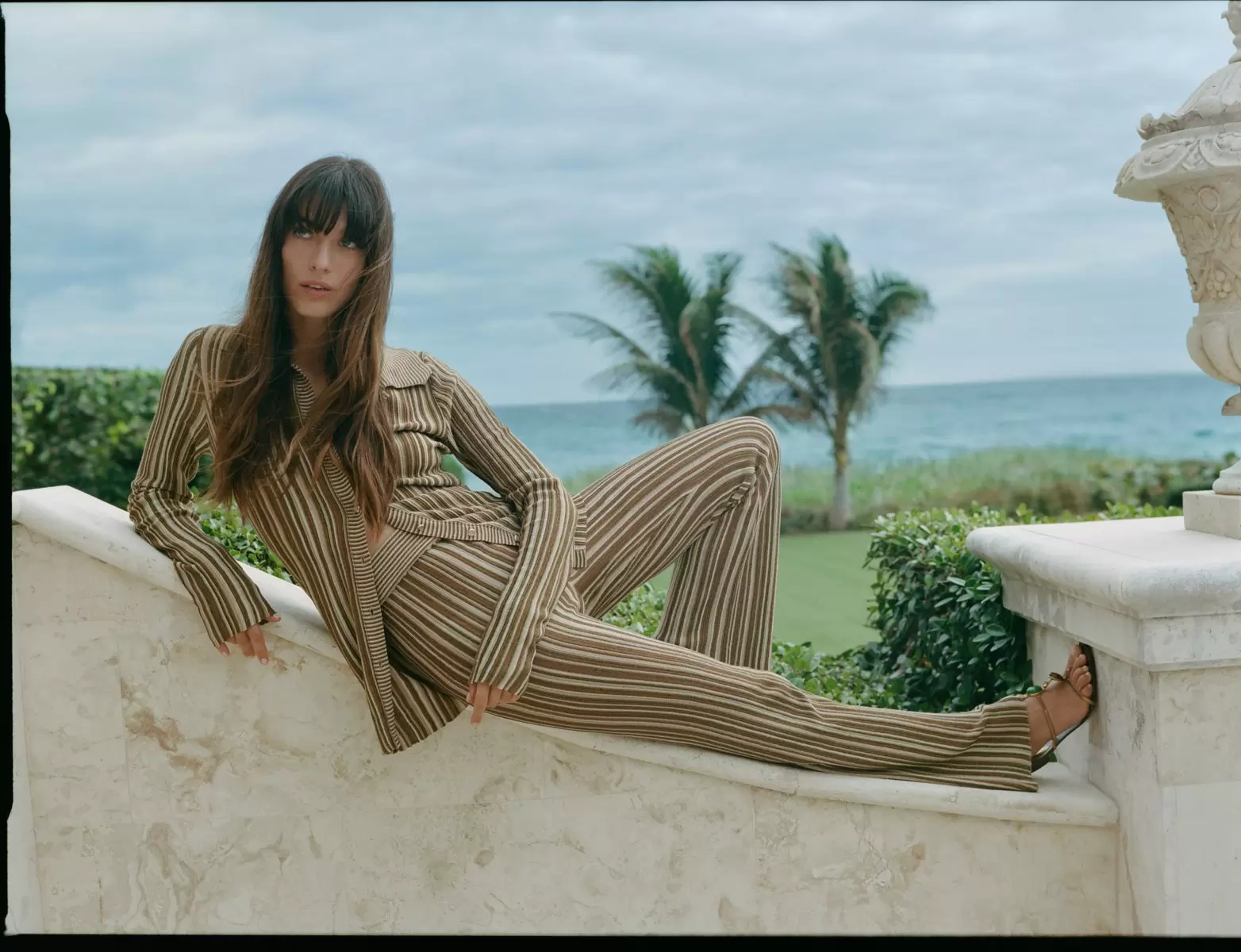 Woman in elegant dress relaxing by the beach.