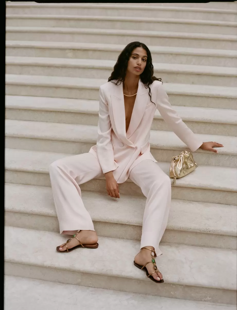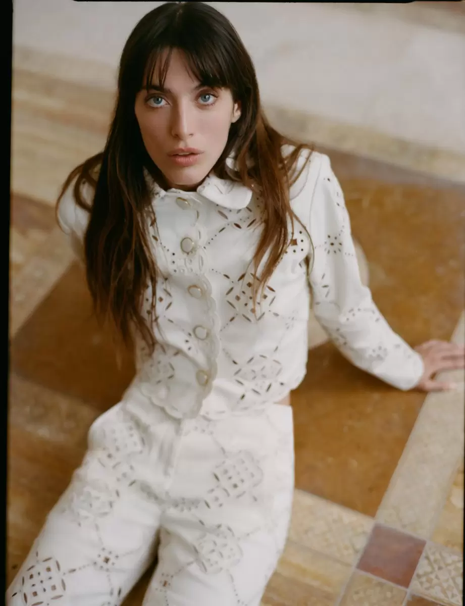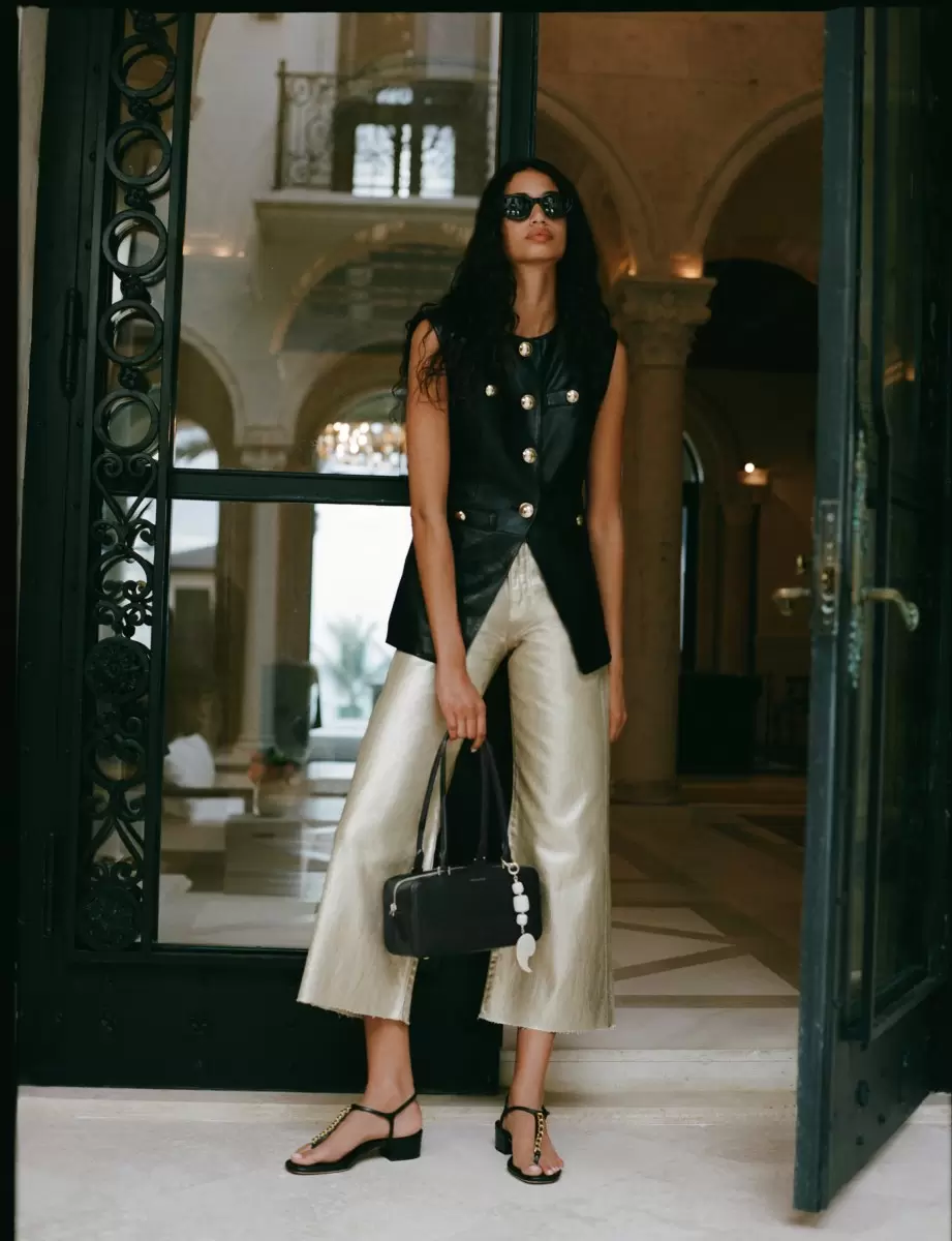 The Spring 2025 collection features a range of silhouettes and materials designed to appeal to a variety of tastes. Standout pieces include: Knit halter dresses, pencil skirts, pedal pushers, and linen suits with a slouchy, casual fit. Mini dresses are paired with chunky sneakers for a modern twist, while silk gowns styled with flat sandals offer a more relaxed, elegant option.Denim takes a prominent role this season, with statement-making designs such as super-flare patchwork, perforated details, diamond laser patterns, printed paisley, and embroidered eyelet. Luxurious fabrics like black napa and gold full-grain leather add a refined yet wearable touch to the collection.