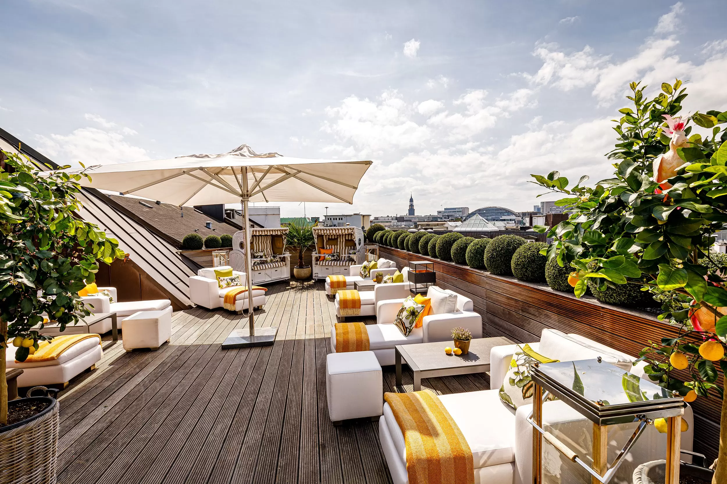 That mezzanine also looks onto Deck 4 , the Vier Jahreszeiten’s outdoor summer terrace that sits directly on the lakeside and offers a wide selection of drinks and small plates to the accompaniment of a perfectly curated soundtrack and breathtaking views. Imagine a beach club transposed to the city centre and that’s Deck 4. Further outdoor space is provided by the Hotel’s recently reopened rooftop Terrace which affords spectacular views over the Inner and Outer Alster as well as the cityscape. A perfect way to start to your evening, enjoying the Hanseatic sunset and the wide array of beverages and dishes that are on offer