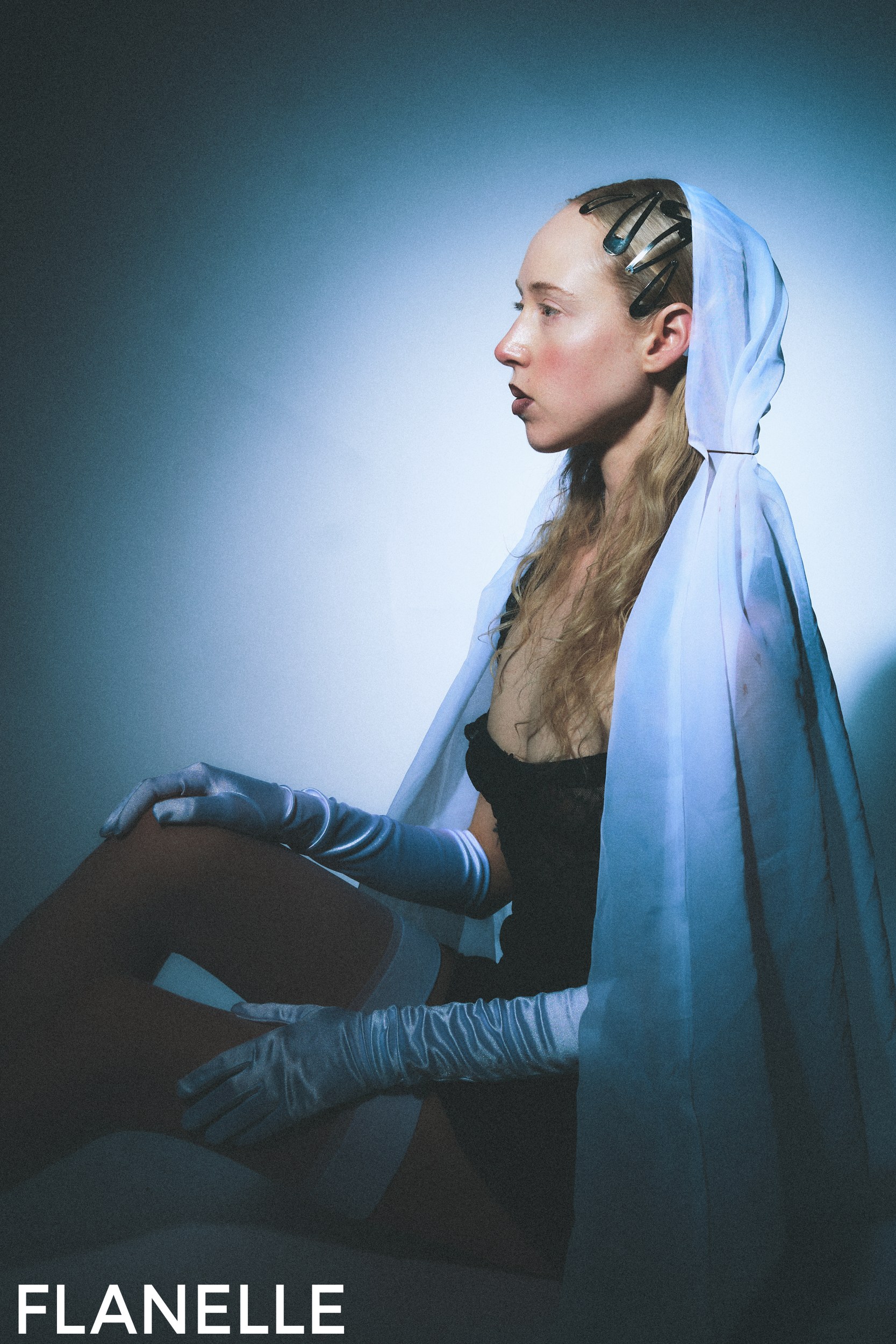 Fashion model in artistic lighting wearing veil and gloves against blue background.