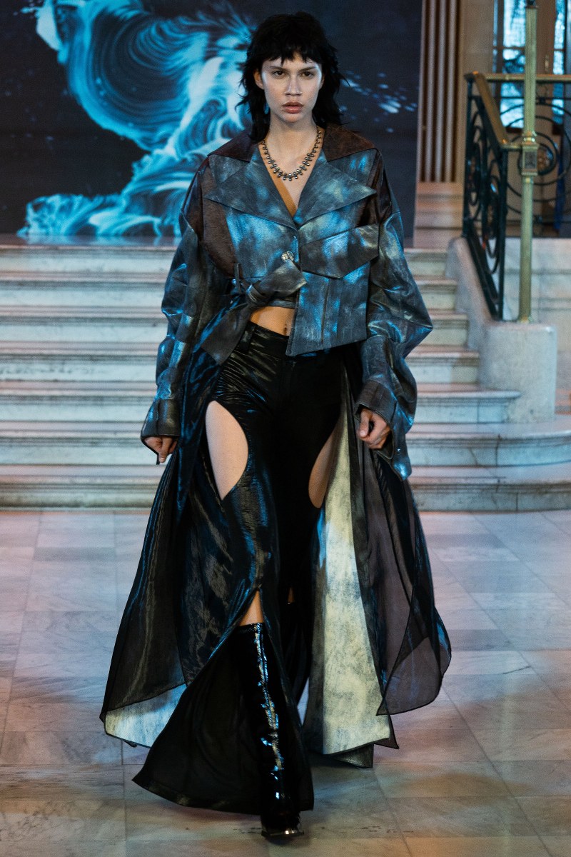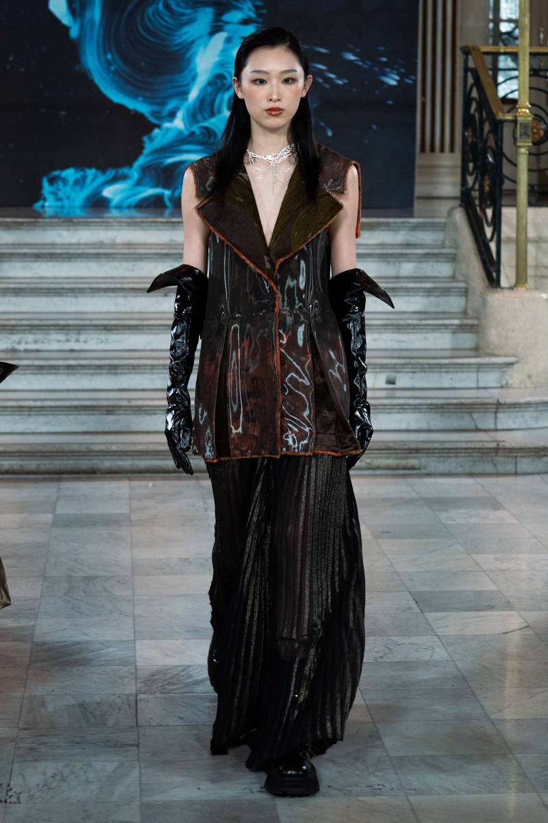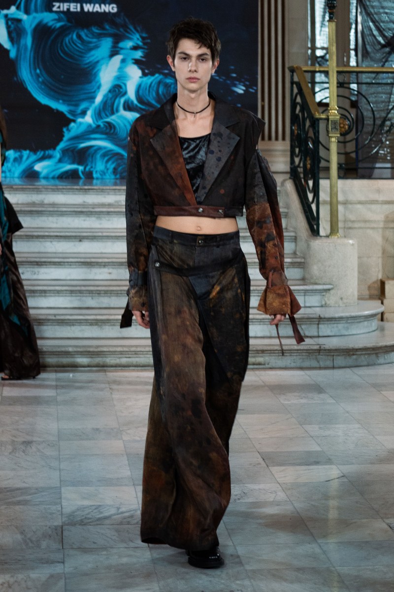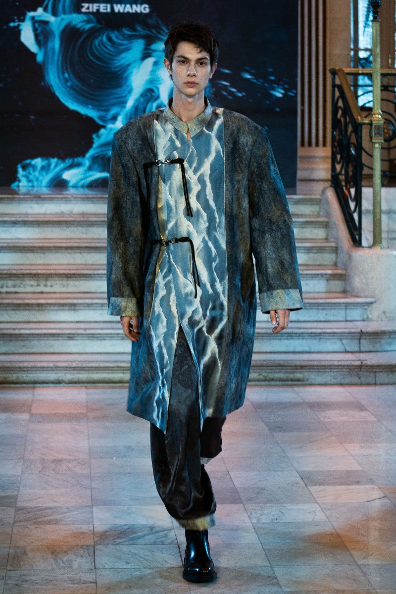 What made the collection particularly mesmerizing was its focus on craftsmanship. Zifei Wang’s commitment to artisanal detail was evident in her use of abstract hand-drawing, fabric modification, and patchwork. The interplay of Western deconstruction techniques with traditional Chinese cutting methods resulted in pieces that were both wearable and artful, creating a sensory experience for the audience. Each garment felt like a piece of living history, reimagined for a new era, with flowing silhouettes that mirrored the river’s never-ending journey.